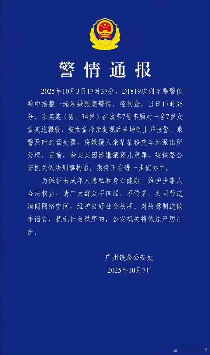 【警方通报男子火车上猥亵女童】34岁男子火车上猥亵女童被刑拘这两年坐火车,乘警都会提示这个,有些不法分子敢眼皮底下犯事,严惩不贷