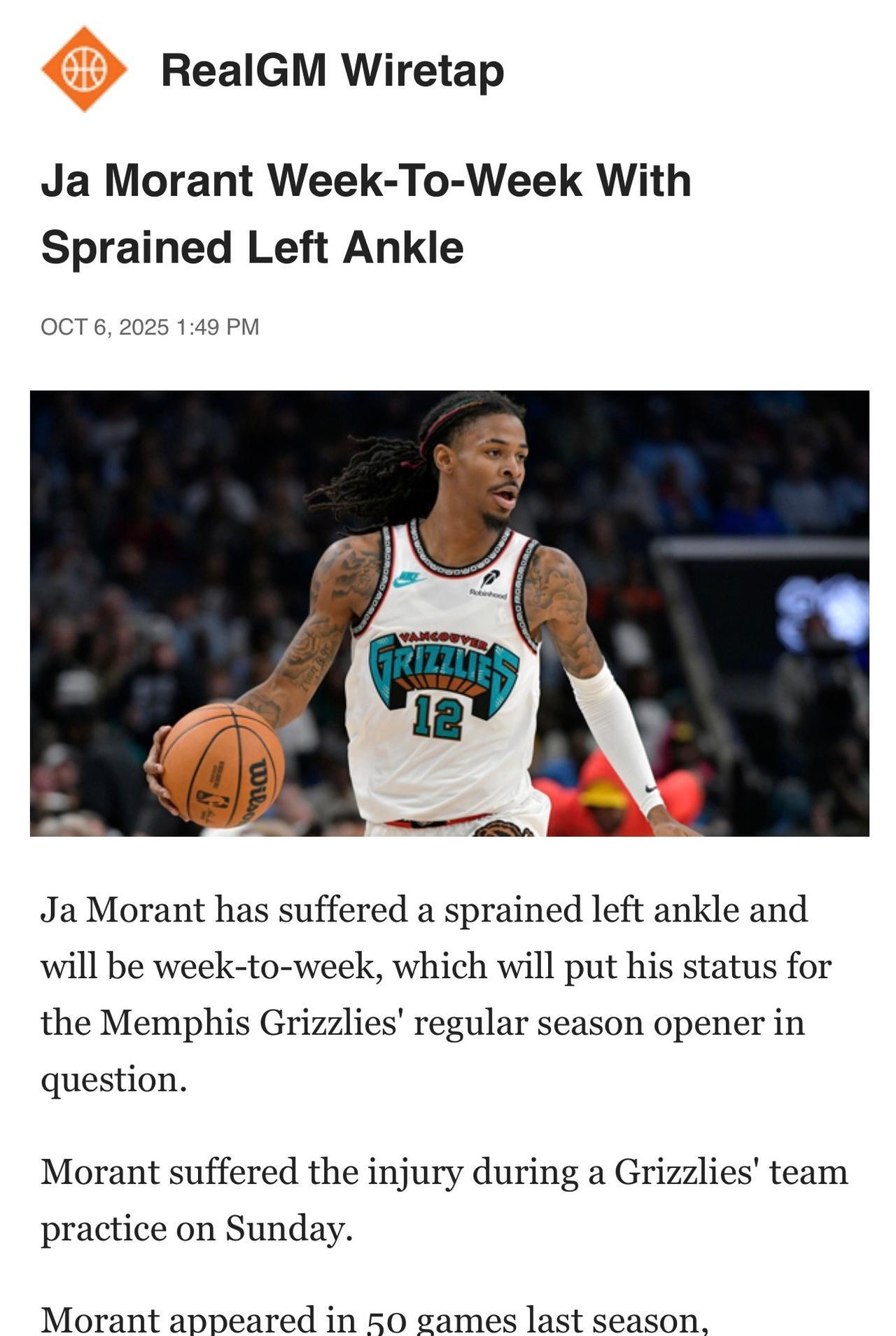 莫兰特在训练中扭伤脚踝! 据灰熊跟队记者爆料:莫兰特在周日的训练中受伤,扭伤了左脚踝,将进入每周观察名单。 虽然还没有公布扭伤等级,但是揭幕战能不能出战目前还存疑,灰熊目前伤兵满盈全,赛季还没有开始,队内三大内线全部受伤,赛季初都无法复出。 近3个赛季莫兰特缺席了126场比赛,而灰熊的胜率只有51.2%,可见缺阵影响有多大。 莫兰特在月初刚表示自己新赛季要打满82场比赛,没过几天就在训练中受伤。#NBA# #孟菲斯灰熊# #莫兰特# #NBA热点# #NBA睿闻#