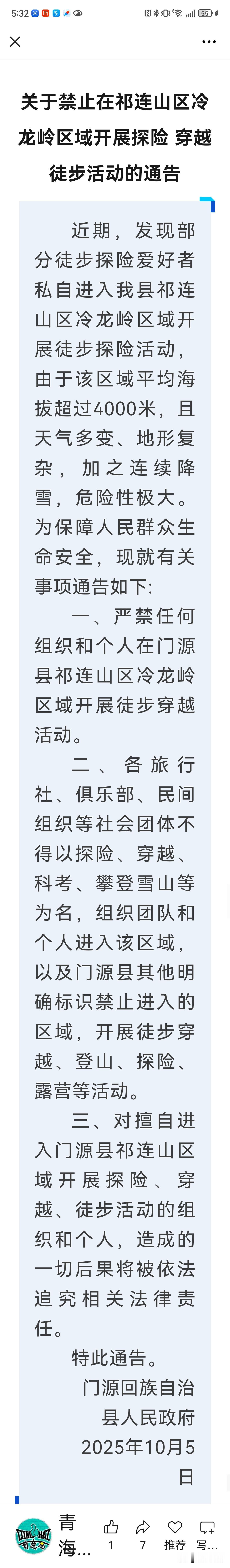 青海紧急封山!海北州禁止在未开放开发区域搞旅游探险等活动! 海北州最新通告:即日起,严禁任何组织或个人在海北州未开发区域开展旅游、探险、穿越等活动。近期部分人员擅自进入未开放区域,已引发多起险情,包括迷路、失联及遭遇山洪、降雪等极端天气,生命安全面临严重威胁。 门源县同步严令:祁连山冷龙岭区域(平均海拔超4000米)地形复杂、天气多变,加之连续降雪,擅自进入者将依法追责。10月5日,百余名徒步爱好者违规穿越老虎沟,致1人死亡,搜救行动耗资巨大。 官方强调:违规活动不仅危及个人生命,更浪费公共救援资源。请公众严格遵守通告,切勿以身试险! 秋日生活打卡季 头号创作者激励计划