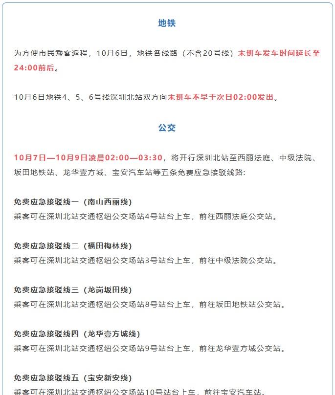 【没想到啊!凌晨3点赶到深圳ta还在等我】深圳地铁公交延时运营了 准备返深的小伙伴看过来,为了方便大家乘车,地铁、公交线路将延时运营。10月7日至8日,深圳地铁各线(不含20号线)、港铁(深圳)13号线将延长运营服务时间1小时,各线路末班车发车时间延长至24:00前后。在此基础上,10月7日至8日,港铁(深圳)4号线延长运营服务时间2.5小时。返程堵车 10月7日至8日,深圳北站(4、5、6号线)双方向末班车发出时间不早于次日2:00。10月7日—10月9日凌晨02:00—03:30,将开行深圳北站至西丽法庭、中级法院、坂田地铁站、龙华壹方城、宝安汽车站等五条免费应急接驳线路,深圳人深夜返深不用愁了!深圳