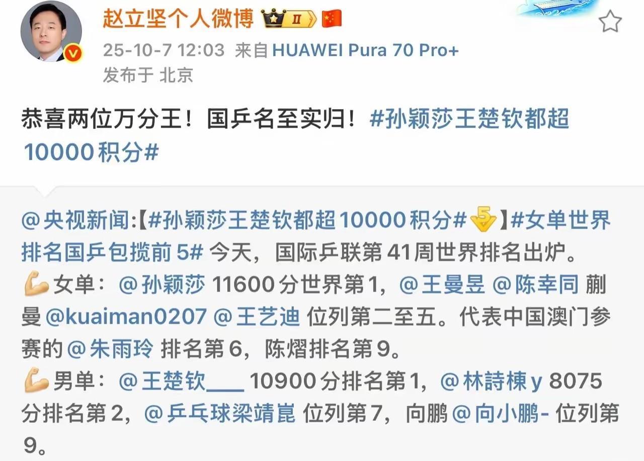 就在今天,10月7日,外交官先生又来发文祝贺了! 我们的万分女王,万分先生!国乒名至实归! 发现了吗? 自从去年巴奥之后,坚哥从来没有错过任何一次莎莎和王楚钦的夺冠时刻。 处理国际事务的坚哥在他那个高度持续喜欢的人,和我们喜欢的是同样的人,一定错不了!
