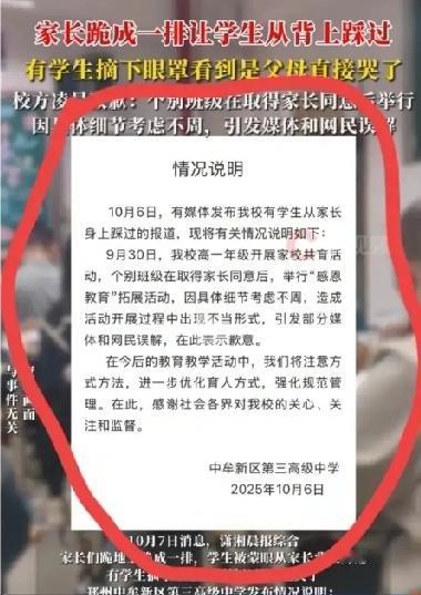 近日,河南郑州中牟县一学校高一年级举行“愧疚教育”,让学生家长一排跪在地上,学生蒙着眼睛,在众人的搀扶下,从家长的背上踩过去。有个女生踩过去后,摘下眼罩,看到踩到的是自己的父母,当时就哭了。 有学生对此活动投诉。10月6日,学校发布情况说明,称是“感恩活动”的拓展,就学校班级组织“愧疚教育”活动出现不当形式,表示歉意。 学校举行感恩活动没有错,让学生踩着跪地的家实为不妥。传统观念是跪天跪地跪父母,哪有父母跪儿女的之理。这是倒反天罡,有悖常理。 父母跪在地上,让儿女踩着过去,学校的初衷是“愧疚教育”,但实为折杀儿女,孩子怎能承受,就如那位女生一样,当场就哭了。 教育孩子,实践活动很重要,正面的实践活动可以鼓励孩子积极的做,反面的实践活动则不能让孩子去做。比如火灾,总不能让孩子为了认识火灾的危害,而制造一次火灾吧。 家长跪地被学生轮流踩过校方致歉教育孩子