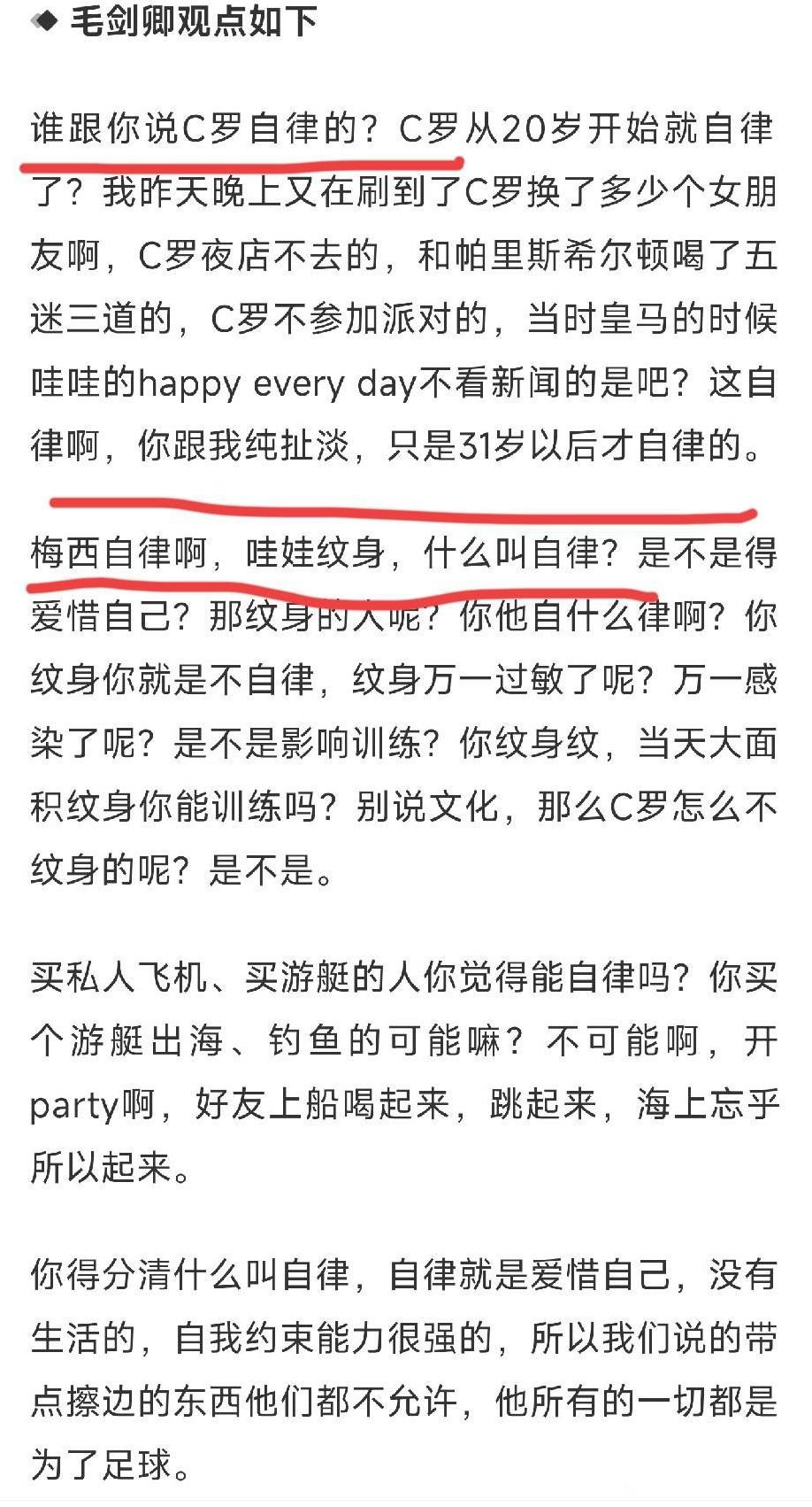 C罗,梅西根本不自律,那是相对自律! 前国脚毛剑卿“自嗨”言论,再次把自己推上热搜! 他居然说C罗,梅西不算自律,只是相对自律,自律的人不应该有纹身,不应该找女朋友,更不应该有游艇,私人飞机! 按毛剑卿的理论,他除了喝点酒,说些胡话,绝对属于顶级自律了?估计他在炮轰C罗,梅西之前喝了多少?