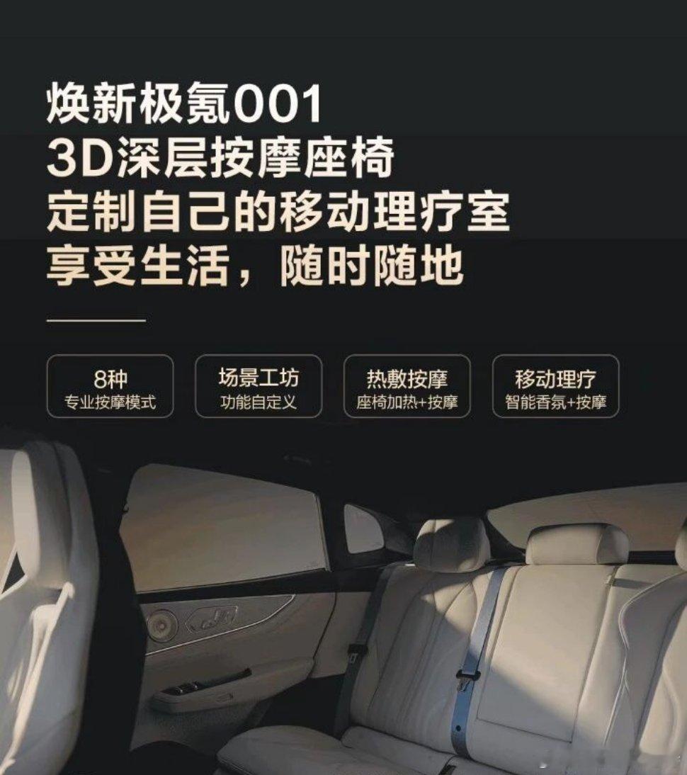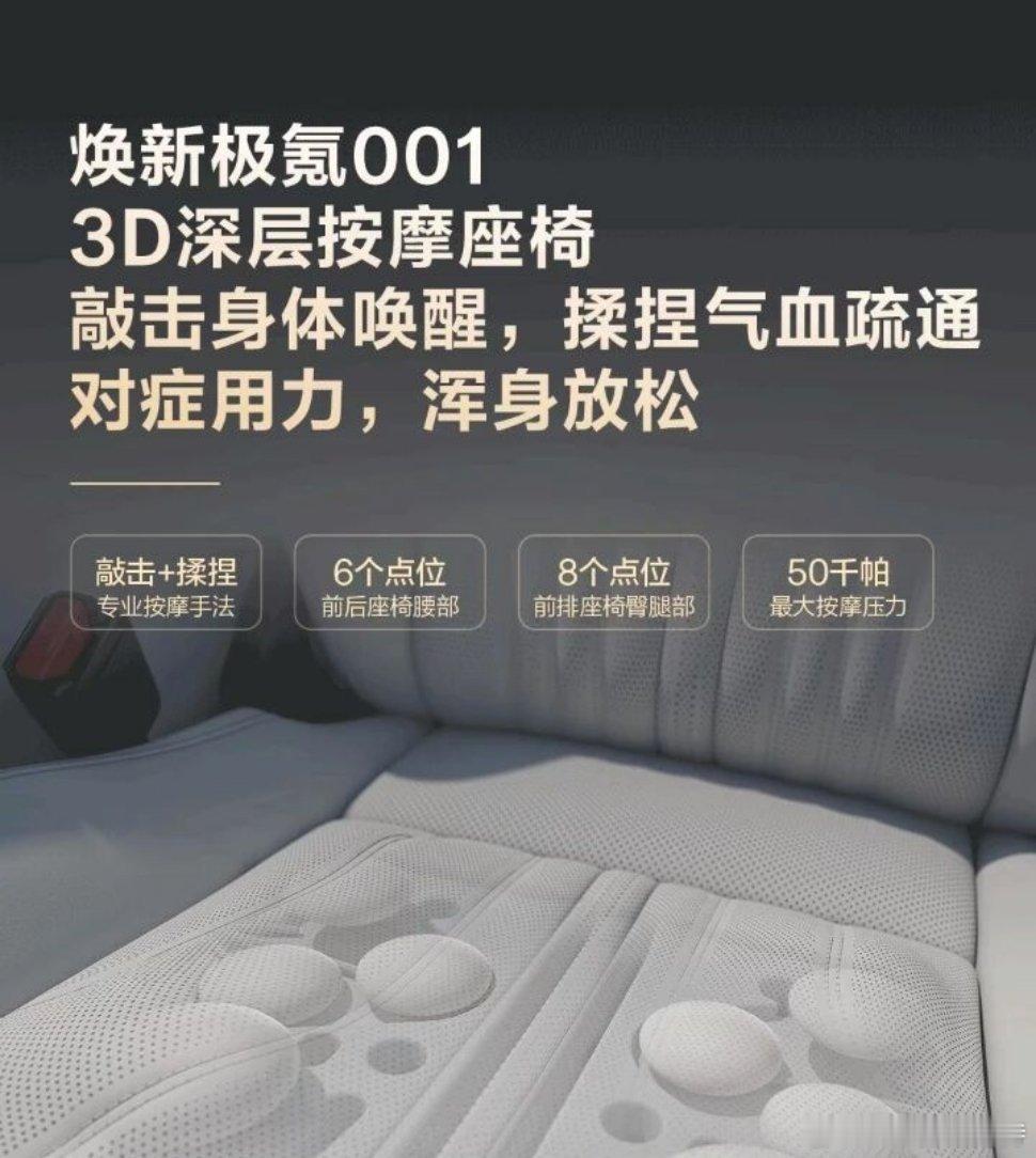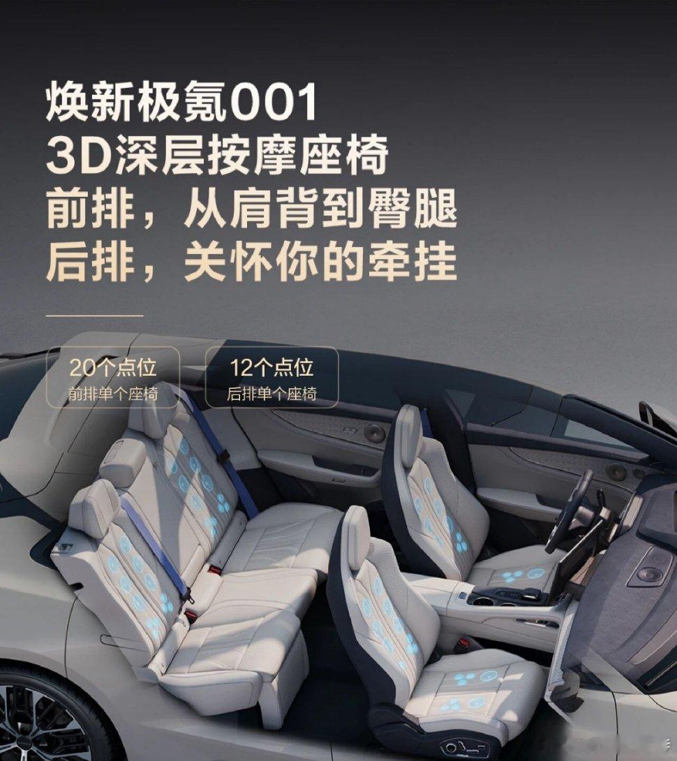 焕新极氪001,前后排座椅加热通风按摩。前排不但能按肩颈,腰背,还能按屁股!跑长途缓解疲劳,好评!极氪[超话]焕新极氪001百万级内饰曝光