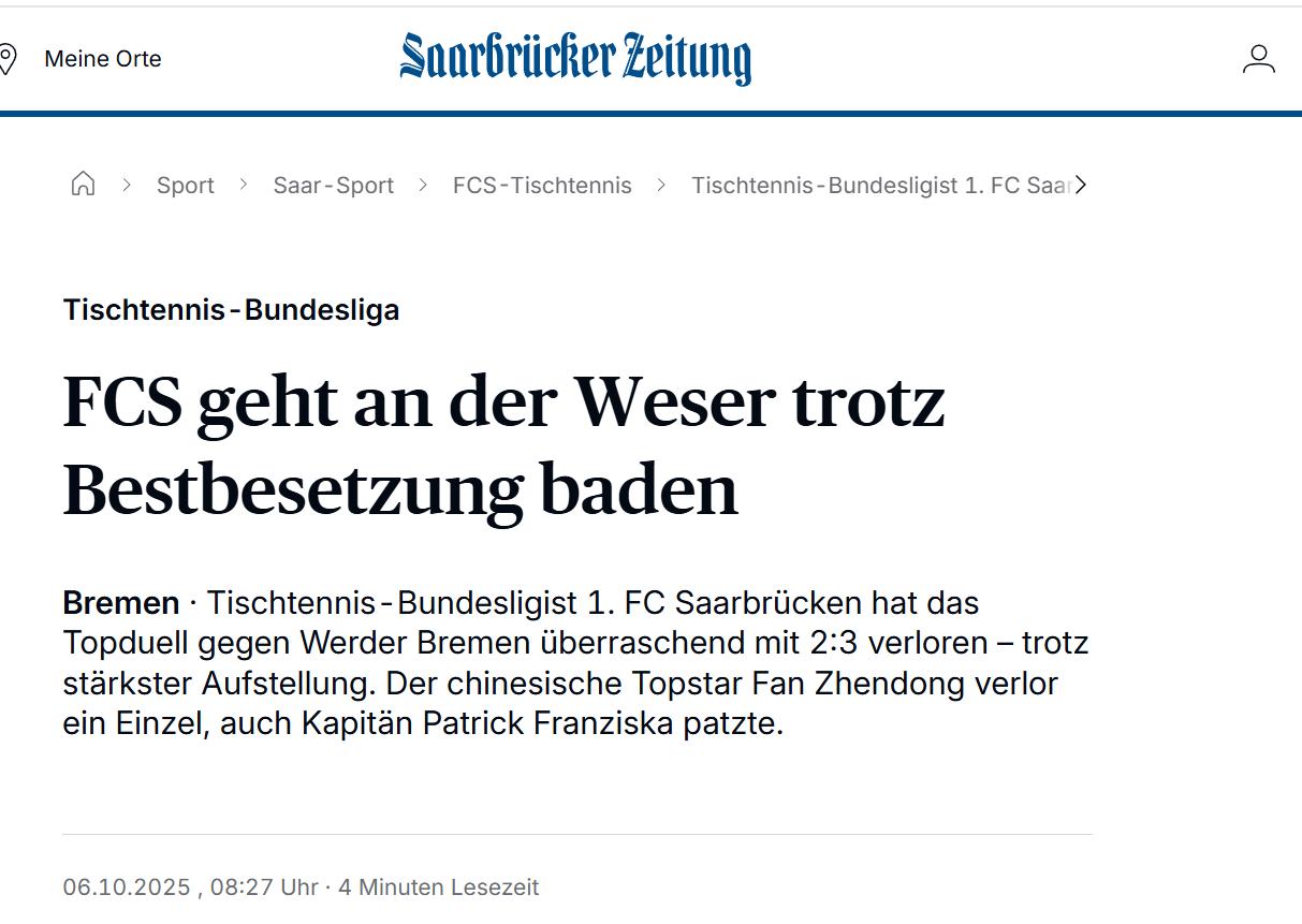 萨尔布吕肯媒体对樊振东的报道口径发生了明显变化,小胖德甲刚开始爆冷输球的时候,《