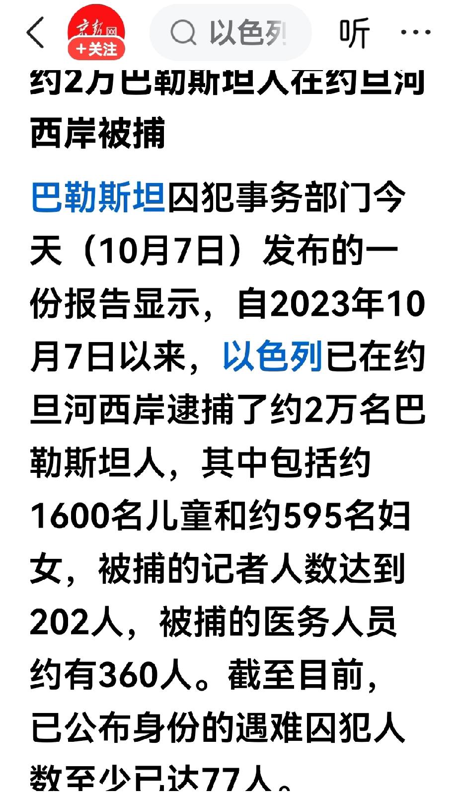 有一组数据触目惊心! 自从2023年7月以来,以色列在约旦河西岸共逮捕约2万巴勒斯坦人。 其中儿童1600人, 妇女595人, 记者202人, 医务工作者360人。 被抓捕的2万人沦为囚犯,其中77人因虐待而死亡,虐待的方式主要有三种,酷刑、饥饿与性侵。 约旦河西岸是确确实实的平民,那里的平民面对以色列的居民点扩张只有呻吟、没有反抗,更谈不上是哈马斯,特别是1600名儿童,595名妇女能是哈马斯吗? 数据能说明一切,数据更能证明谁是恐怖主义分子。