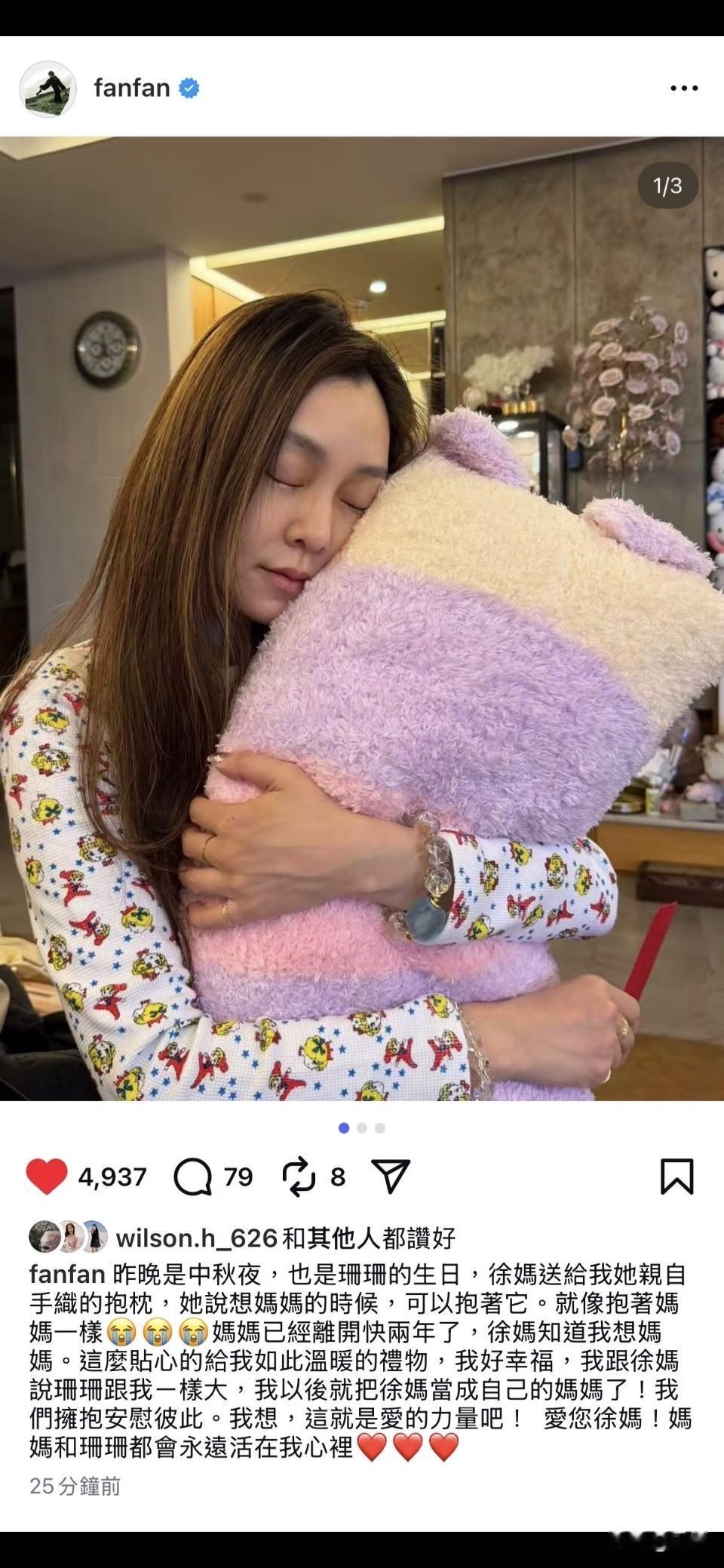 我们的范范姐真是人美心善啊! 昨天的中秋节范范去陪S妈过节了,还亲切的说会把S妈当自己的妈妈看待。S妈还贴心的送了一个抱枕给她。[可怜] 明明很友好,很相爱的姐妹朋友们,和一家人,被人抹黑带节奏,宣传成冷血无情的友情和亲情。[可怜] 一个失去女儿一个失去妈妈…祝范范和徐妈都能平安健康,平静幸福。s妈 范玮琪