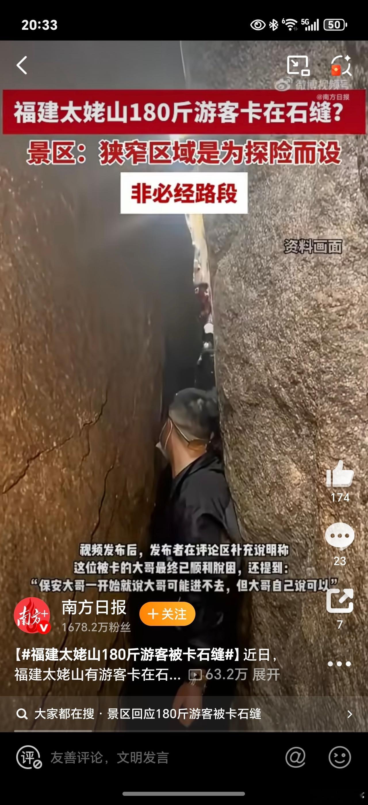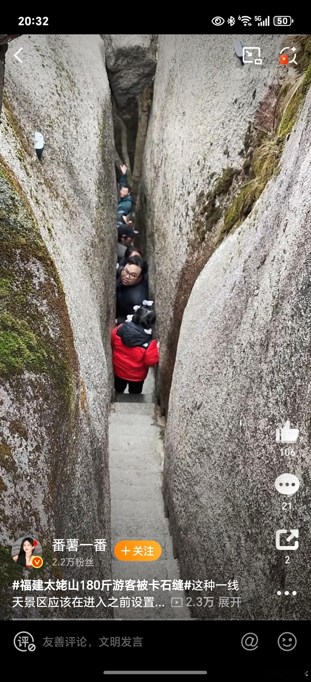 福建太姥山180斤游客被卡石缝这是对自己的体重心里没数吗?这都敢往里挤[吃惊]?