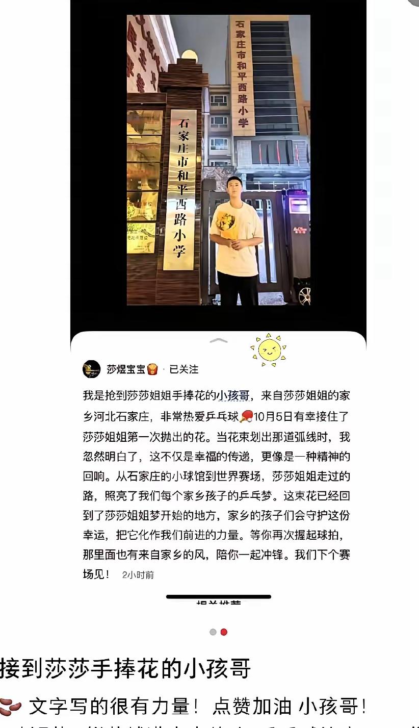 抢到莎莎手捧花的小孩哥,这缘分真是太好了! 同是河北人,同是石家庄人,小孩哥带着花去了莎莎从小梦开始的地方,幼儿园、小学、河北体育局、国家体育总局。 小小的一束花不仅仅是幸运的传递,更是精神的传承。小孩哥,带着莎莎的光,一起向未来奔跑吧! 这束被小孩哥紧紧攥在手里的手捧花,从来不是普通的鲜花。它沾着赛场的汗水,裹着莎莎一路拼搏的故事,更连着两个石家庄人的双向奔赴——一个是站在世界舞台上为国争光的奥运冠军,一个是怀揣憧憬的普通小孩,因为一束花,因为同一片故土,命运的丝线轻轻缠绕在一起。 小孩哥捧着花走过的那些地方,每一步都踩在莎莎追梦的轨迹上。幼儿园里,或许还留着莎莎第一次拿起乒乓球拍时的好奇;小学的操场边,可能回荡过她放学后加练的脚步声;河北体育局的训练馆里,藏着她无数次摔倒又爬起的倔强;国家体育总局的赛场上,见证着她从地方小将成长为世界冠军的蜕变。小孩哥走的不是简单的打卡路,而是沿着莎莎的足迹,触摸着一个冠军梦想生根、发芽、开花的全过程。 这束花的传递,比任何说教都更有力量。大人们总说要向榜样学习,可对一个孩子来说,抽象的道理远不如一束真实的花、一段看得见的追梦路来得鲜活。当小孩哥站在莎莎曾经训练的球台前,看着那些磨损的球拍、泛黄的奖状,他或许能真切感受到:原来奥运冠军不是天生的,而是从和自己一样的平凡日子里,一步步拼出来的。这种感受,会变成一颗种子,悄悄埋在他心里,说不定某天就会长出属于自己的梦想。 莎莎的光,从来不是遥不可及的星光,而是照进普通人生活里的温暖。她不是高高在上的偶像,而是从石家庄的街巷里走出去的邻家女孩,她的努力、坚持、不放弃,都是最贴近生活的精神范本。小孩哥带着这束花奔跑的样子,像极了无数被莎莎激励的普通人——我们或许成不了奥运冠军,但可以像她一样,为了自己的小目标全力以赴;我们或许走不上世界赛场,但可以在自己的生活里,活成一束小小的光。 这束手捧花的故事之所以动人,正因为它藏着最朴素的情感:榜样的力量,从来不是让别人仰望,而是让更多人相信我也可以;传承的意义,从来不是复制别人的人生,而是接过那份坚持与热爱,活出自己的精彩。小孩哥带着花奔跑的背影,是这场传承最好的注脚——从莎莎到他,从过去到未来,总有一束光,在照亮着追梦人的路。 各位读者你们怎么看?欢迎在评论区讨论。 孙颖莎把鲜花扔向观众席送给球迷 带小孩哥追星