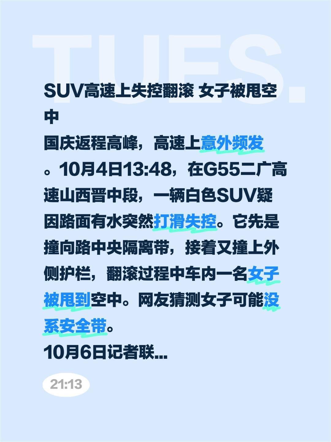 SUV高速上失控翻滚 女子被甩空中 国庆返程高峰,高速上意外频发。10月4日13:48,在G55二广高速山西晋中段,一辆白色SUV疑因路面有水突然打滑失控。它先是撞向路中央隔离带,接着又撞上外侧护栏,翻滚过程中车内一名女子被甩到空中。网友猜测女子可能没系安全带。 10月6日记者联系晋中高速交警,因视频发布者不是当事人,事故详情不便透露。雨天路滑,这起事故再次给我们敲响警钟,高速行车一定要减速慢行,更要系好安全带,这可是守护生命的防线,千万别拿生命开玩笑。
