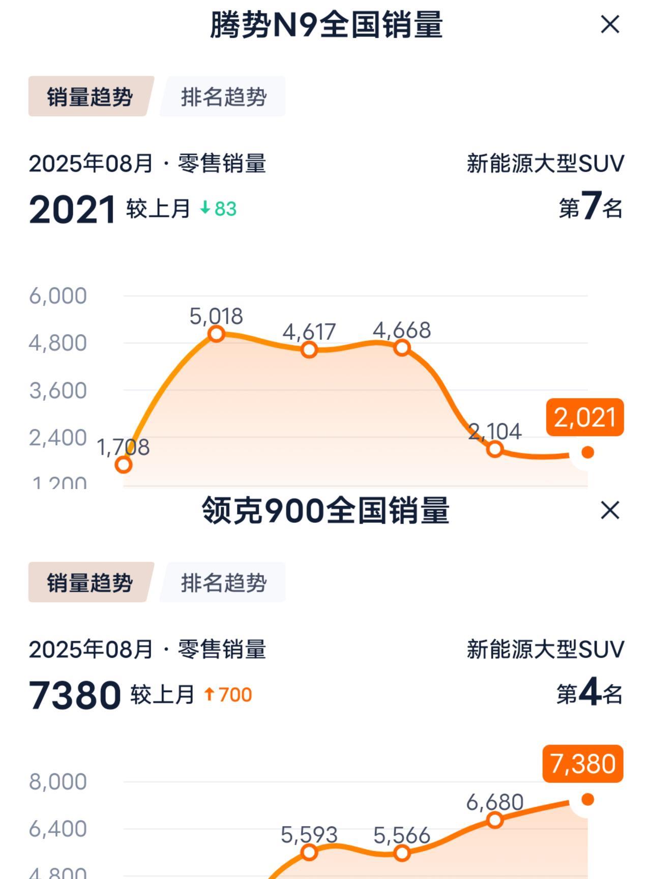 [给力]腾势N9上市次月卖出5018辆 [吐舌]领克900上市次月卖出2625辆 [狗头]如今领克900月销7380辆 [不看]而腾势N9月销只有2021辆 市场太现实了,一个开局即巅峰,一个低开高走。 领克900:你大哥N9都干不过我,你还来当炮灰? 腾势N8L:那是我大哥卖太贵了,到我跟你一个价,看谁才能笑到最后。 网友:既然以销量论,我买M8不是更好吗?[偷笑]