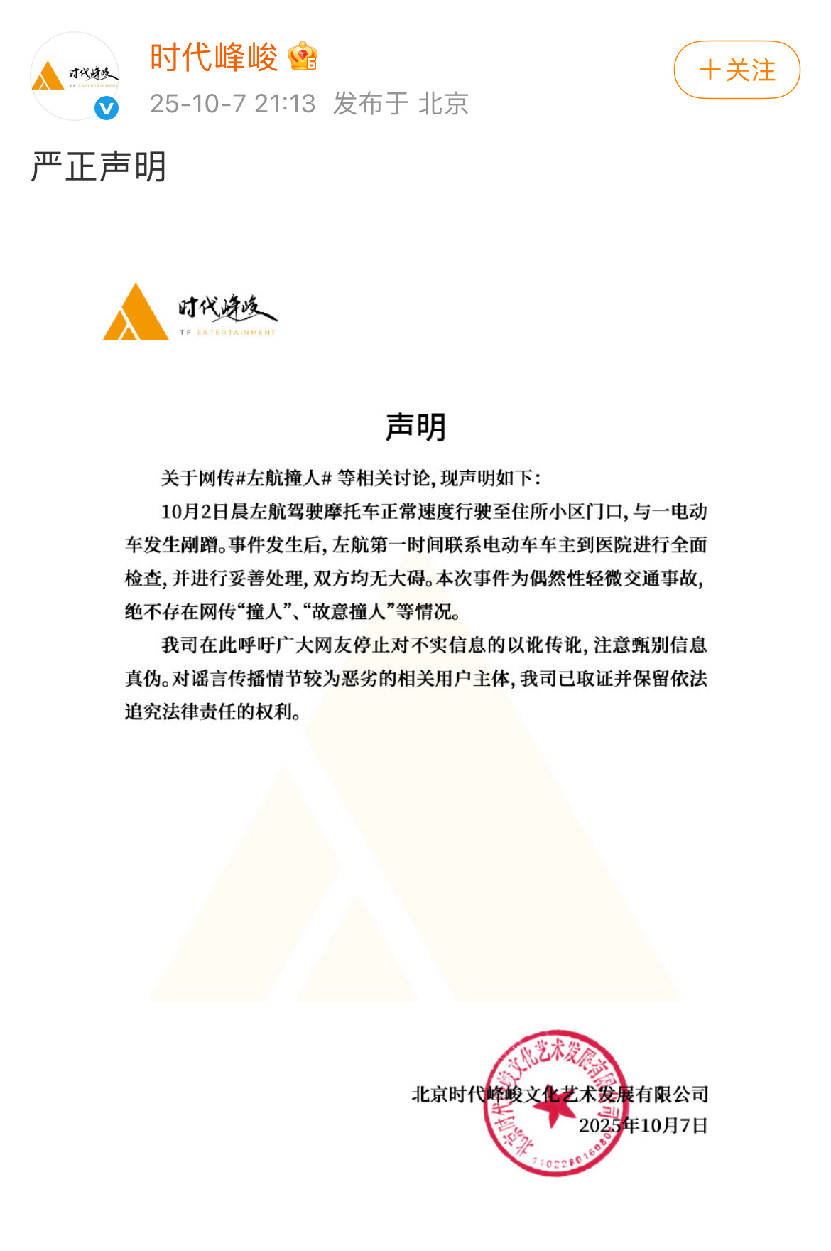 左航 撞人 时代峰峻发声明系电动车发生剐蹭,左航联系车主第一时间去医院检查处理,