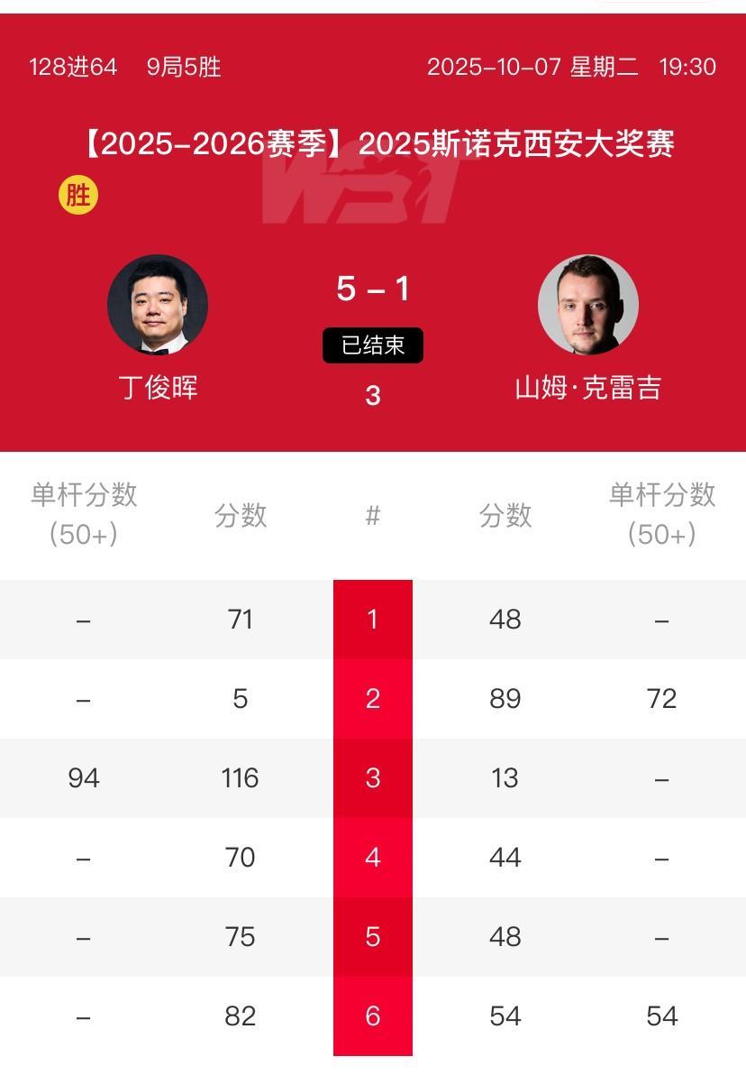 西安大奖赛 丁俊晖5-1轻取克雷吉 晋级64强 下一轮将比赛乔丹布朗 10月7日斯诺克西安大奖赛正赛开打,丁俊晖状态神勇。他以5 - 1的比分轻松战胜山姆·克雷吉,强势晋级64强。 丁俊晖可是中国斯诺克的代表人物,世界排名第8,有15次排名赛冠军、4次三大赛冠军的辉煌战绩。对手山姆·克雷吉世界排名第92,虽然偶尔能超常发挥,但这次遇上丁俊晖也难敌其锋芒 比赛中,丁俊晖首局71 - 48先声夺人,第三局还打出单杆94分。接下来他的对手是乔丹·布朗,期待他继续精彩表现,去冲击85万英镑总奖金中的17.7万英镑冠军大奖。