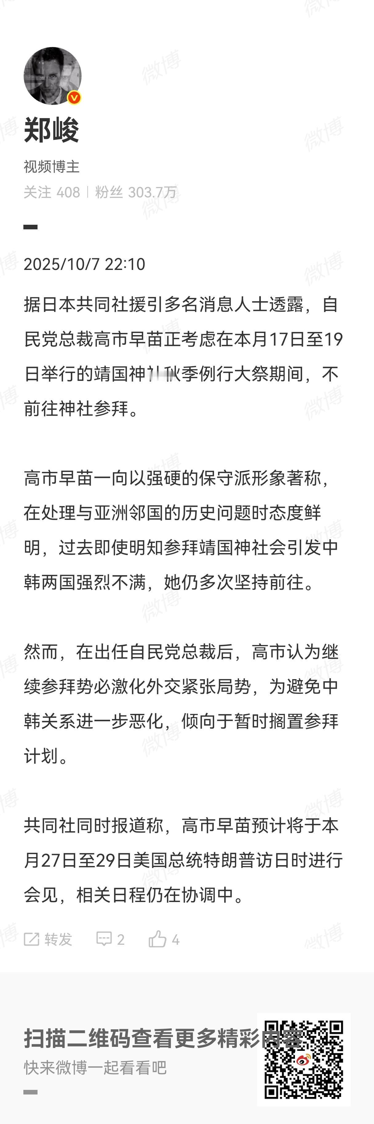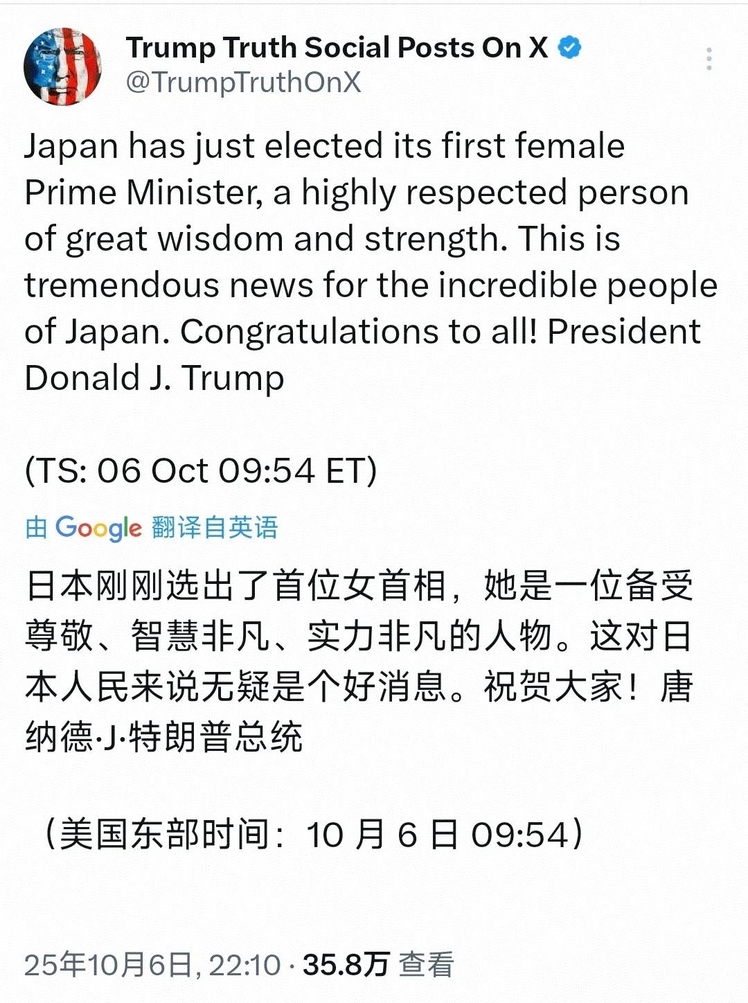 高市早苗目前是自民党总裁,还不是日本首相,但特朗普总是“快人一步”,已经在10月6日在自己的社交账号上发表了贺信,称赞高市早苗“备受尊敬、智慧非凡、实力非凡”。意思是高市早苗是美国人中意的日本首相(石破茂不是,所以干不下去了)。 然而,高市早苗估计会让特朗普失望了:日元这两天已经跌到历史低点(151左右,即1美元兑换151日元),高市早苗的考验才刚刚开始。首先高市早苗要和美国掰扯清楚5500亿美元的准入费问题,其次才是日美悬而未决的关税问题。面对日本国内重重压力,高市早苗的一些言论目前已经改口:日中经济相互依赖,需要通过加强合作。那供奉战犯的地方,更是提都不敢提了。