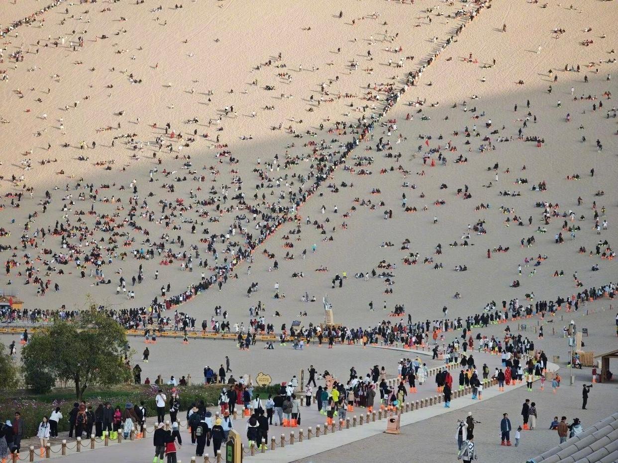 告诉王维,西出阳关全是人 所谓“天涯”不过是一场说走就走的旅行 一眼望去看不到沙漠 若王维穿越到今秋的敦煌,怕是要改写下那句千古绝唱:“劝君更尽一杯酒,西出阳关全是人”。国庆期间刷爆抖音的画面太鲜活——曾经“黄沙接天日”的阳关古道,如今被攒动的人群填满,网友调侃“一眼望去看不到沙漠,全是举着相机的游客”,这场景里藏着的,是两千年最动人的时空对话。 当年王维落笔“西出阳关无故人”,本就藏着个历史“误会”——元二出使安西本不走早已废弃的阳关,诗人笔下的“阳关”从来都是文化符号:出了这道关,便是异质文化的疆界,是“故人难觅”的陌生天地。那时的阳关是真正的“天涯”汉代烽燧孤零零立在墩墩山上,见证的是商队的孤影与离人的叹息,就连考古学家都曾形容它只剩“阳关眼目”般的寂寥。 可如今站在同款烽燧下极目远眺,景象早已颠覆古今。穿汉服拍写真的姑娘挨着啃蜜瓜的大叔,研学的学生围着讲解员听“列四郡据两关”的往事,有人在“古董滩”寻陶片,有人对着王维塑像拍视频。曾经“空手不回还”的遗物之地,现在流通的是欢笑与分享;当年需要数月跋涉的丝路,如今自驾、高铁就能抵达,所谓“天涯”不过是一场说走就走的旅行。 这拥挤的阳关从不是“失了古意”,恰恰是历史最好的延续。汉代它是中西交流的锁钥,唐代它是文化记忆的载体,而今天,它成了中国人触摸历史的纽带。那些举着手机的游客,和当年穿越戈壁的使者、僧侣本质上并无不同——都是在追寻远方与未知,只是从前的“无故人”,变成了如今的“皆故人”。 当敦煌的风掠过攒动的人群,吹过汉代烽燧的残垣,我们突然懂了:王维的伤感从不是终点,跨越千年的热闹与联结才是这片土地最动人的答案。你去过阳关吗?评论区说说你眼中的古今反差~