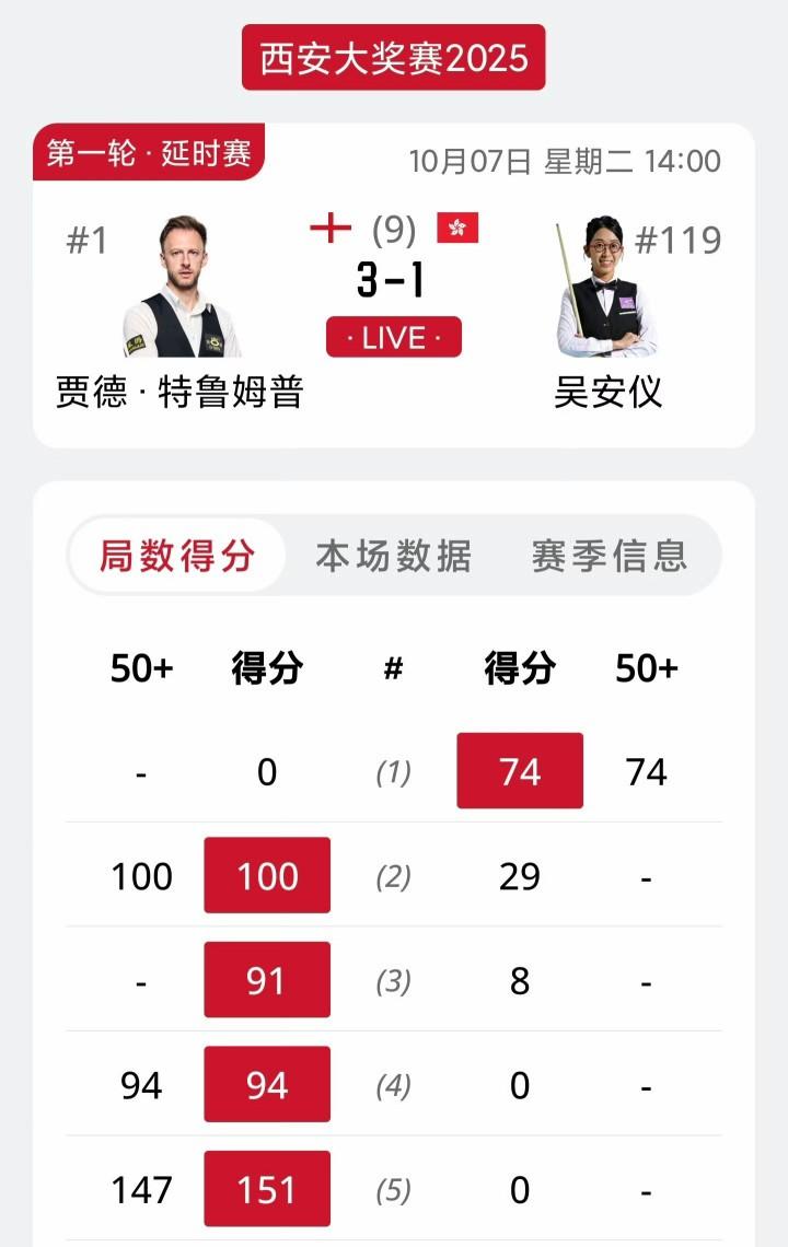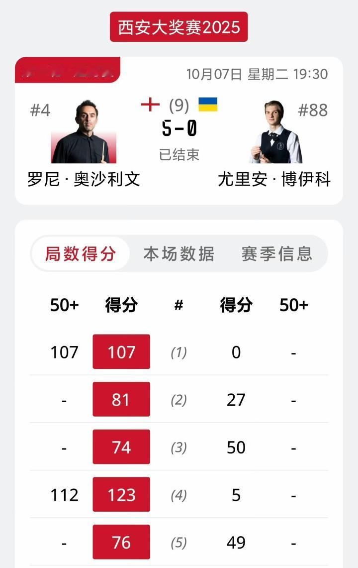 2025斯诺克西安大奖赛,奥沙利文vs博伊科,这是奥沙利文第1000场排名赛。 奥沙利文5-0博伊科 完美的第1000,两杆单杆过百,破百总数1302。 特鲁姆普打出职业生涯第9杆147,时隔三年,准神重返巅峰。