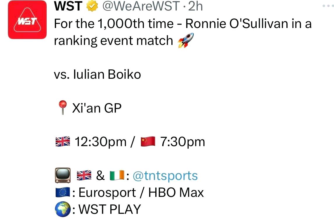 2025斯诺克西安大奖赛,奥沙利文vs博伊科,这是奥沙利文第1000场排名赛。