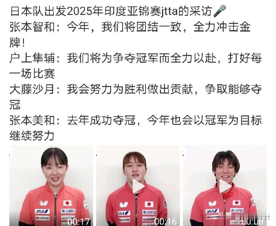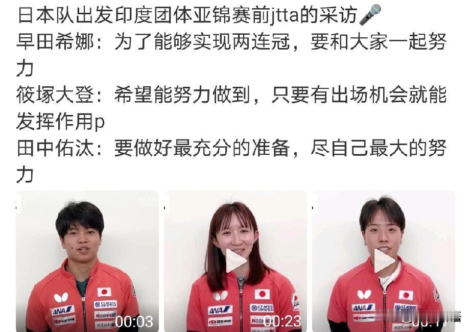 日乒也在今天出发飞印度了。 今年的亚锦赛伊藤美诚没有参赛,桥本帆乃香参加了,伊藤美诚抱着她的猫咪,在度假呢,在印度比赛,不去挺好的。看到东电发了日本队参赛运动员阵容,张本智和和桥本帆乃香是在C位了。刚刚看到他们也已经飞往印度,长崎美柚是后天出发,在出发前还接受了采访。去年日本女队是拿到了团体赛的冠军,今年只有团体赛,看到张本美和、早田希娜、大藤沙月等都接受了采访。 早田希娜在采访中说去年她没有参赛,为了实现两连冠,要和大家一起努力。去年的亚锦赛,早田希娜因为手腕受伤没有参赛,今年她参赛了。张本美和在采访中说:“去年成功夺冠,今年也会以冠军为目标继续努力”。日乒女队这次看起来信心满满啊,下午看到韩国队也已经出发了,采访中韩国女队的教练说这次的目标是打进决赛。 看到说国乒明天出发,今天看到莎莎他们还去训练了,这是就休息了一天,就要去参加升国旗的比赛了。去的时候要多带些水,看到韩国队徐孝元带了很多吃的,国乒应该也会给运动员做好后勤保障的吧,想想他们去印度比赛,就有点担心,预祝国乒健康完赛,加油!