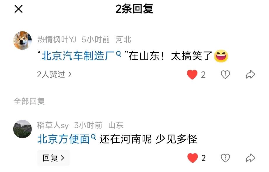 A网友——“北京汽车制造厂”在山东!太搞笑了[大笑] B网友回复——北京方便面还在河南呢 少见多怪[笑哭][笑哭][笑哭]