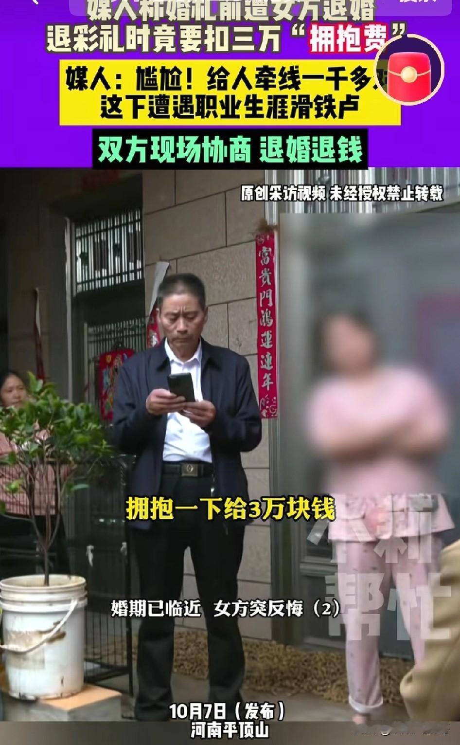 这个有点狠, 拥抱一次扣3万 ! 河南的万先生经媒人介绍跟一个女孩定了亲 ,交往几个月 ,双方将婚事定了下来 , 还照了结婚照。 邻近结婚了,女孩却说要退婚 。 万先生蒙了,我连酒店都订好了,亲戚也通知了,你却突然说要退婚, 问她为什么? 女孩说就是不想跟你结婚。 结婚的彩礼 ,加上恋爱期间的开销,万先生花了差不多20万,女孩却说只同意退17万 。 没办法,王先生就求助小莉帮忙节目组 。 小莉前往女孩家了解情况, 询问为什么女孩突然想起要退婚, 女孩的父亲说双方性格不合 。 现在婚姻自由, 也不能强迫, 那就按照退婚的流程走吧, 花了男方的钱是不是该退给人家 。 万先生说彩礼加上买东西来往开稍女友花了他20万,女孩的家人说只能退17万,因为照婚纱照他们拥抱了, 要扣3万。 真的太奇葩了 , 小莉也是第一次听说,男女谈朋友拥抱了,女方分手要扣男方3万块。 奇葩归奇葩。最后男方跟女方经过协商,女方同意退175000, 谈几个月恋爱,男方损失25000 。 唉, 感觉现在谈恋爱对男方来说真的是高风险的活儿 ,谈不好 ,钱就没了。