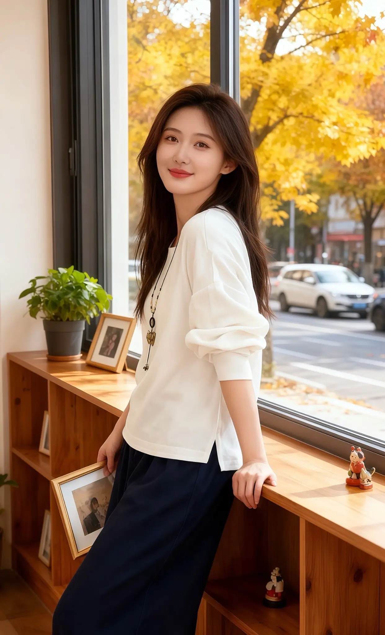 她试穿后,站在窗边,望着外面金黄的梧桐树叶随风飘落。一会儿她靠着窗台,感受着这套衣服带来的舒适自在;一会儿又拿起架子上的相框,回头露出浅笑。这套穿搭仿佛为她开启了一段惬意的秋日时光,让她在都市的喧嚣中,找到了属于自己的那份文艺与从容,每一个动作都透着对生活的热爱与对美的追求。