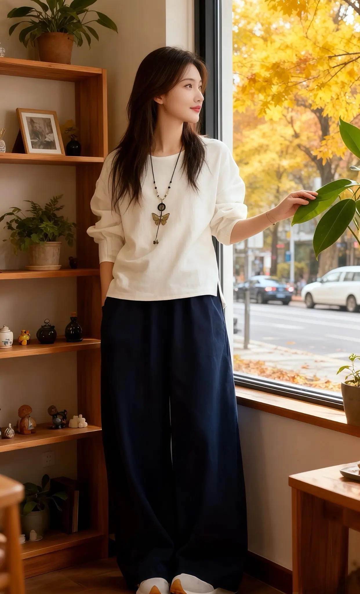 在一个秋日的午后,林薇走进了这家充满文艺气息的小店。店内木质置物架上,绿植郁郁葱葱,相框和小摆件错落有致。她被窗边人体模特身上的那套穿搭吸引,米白上衣搭配藏蓝阔腿裤,简约又不失质感。