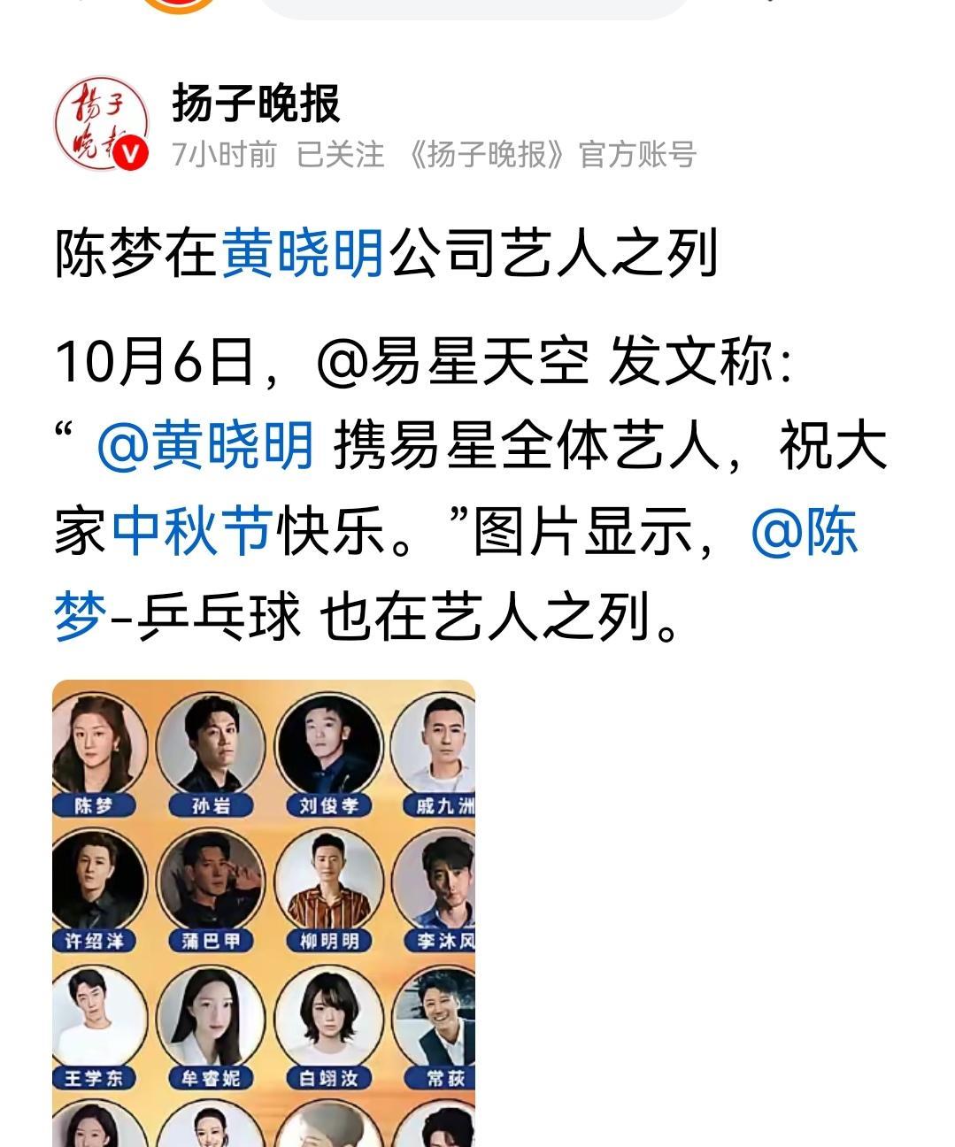陈梦这是一只脚踏进了娱乐圈了吗?易星天空发文,黄晓明携全体艺人祝大家中秋节快乐!