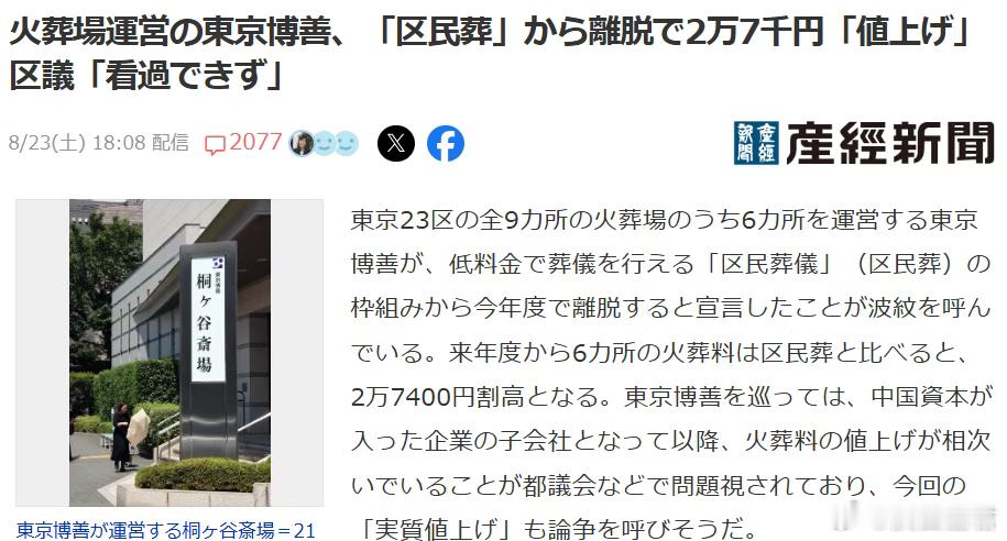 关键是日本人没得选。东京23区是东京的核心区域,人口一千万左右,占东京都人口的70%。而在东京23区内,共有9座火葬场,7座为民营,其中6座由都“东京博善株式会社”掌控。