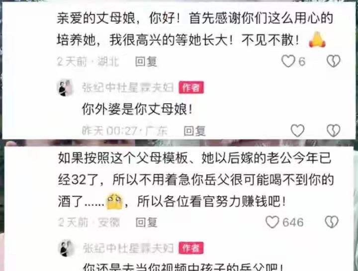 有网友玩梗简直是毫无底线,直接惹火了张纪中,他在评论区开撕,这些网友真的是有些过分了 张纪中有违公众正常婚姻的价值观,“老牛吃嫩草”找了个年轻媳妇,这在现实生活中,确实是有点争议!因为太有违大众的三观了,毕竟张纪中年龄比他现任的老婆要大的多了,可以当她父亲,爷爷辈的人了! 但这也不是网络上的黑嘴,可以调侃张纪中一岁女儿的理由! 张纪中和普通父亲一样,面对自己一岁的女儿被网友玩梗,他不生气才怪。 个人觉得,对事不对人,祸不及家人,张纪中他的女儿才一周岁多,就在他评论区有人说想当他女婿,真的是很不适合! 人家才是一岁的孩子,你就算看不惯张纪中老牛吃嫩草,也要等人家女儿成年后,再去评论区嘲讽、玩梗人家。