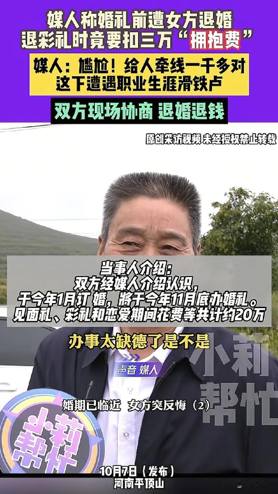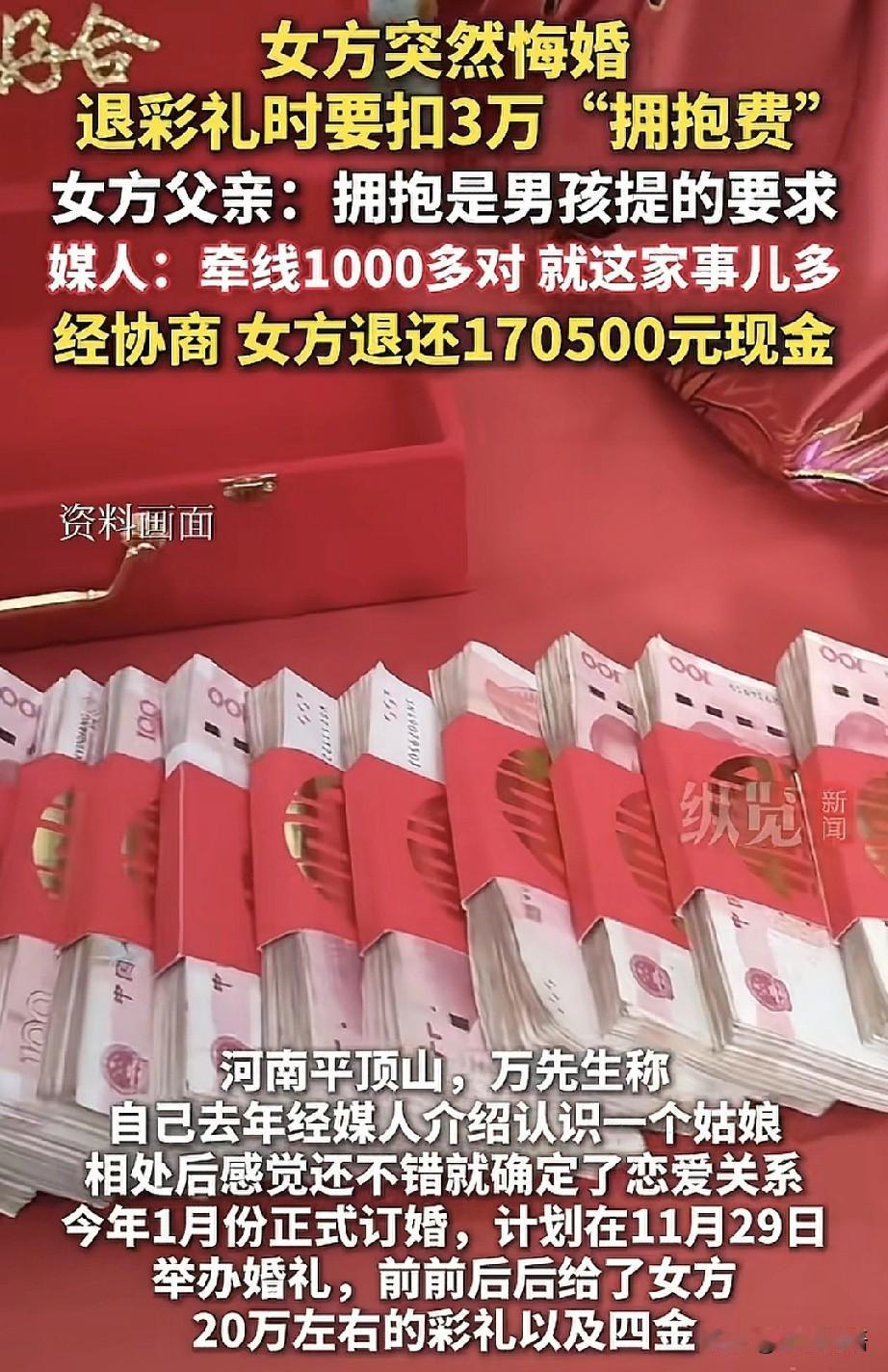 这就有点无耻了,河南平顶山的万先生经媒人介绍与一位女生相识,两人相处一段时间决定订婚,男方给女方20万彩礼及“四金”,订婚后没多久女方就提出分手,理由是不想和他结婚,并且还要扣掉三万块钱的彩礼,理由是拍婚纱照的时候男方拥抱了她,媒人气的只跺脚:“我介绍了一千多对,没见过这么不讲理的!” 河南平顶山的万先生他在去年经由媒人介绍认识了一位女生,两人交往后感觉相处融洽,便确立了恋爱关系,并于今年1月份完成了订婚仪式,原计划在11月29日举行婚礼。 在此期间,万先生陆续向女方支付了约20万元的彩礼,还赠送了“四金”首饰。 婚纱摄影已经完成,婚宴场地也早已订好,亲朋好友全都通知到位,可就在这个节骨眼上,女方却突然表示不愿结婚了。 媒人表示,女方可能是因为觉得万先生为人过于老实,收入也不算高,因而改变了主意。 而在商量退还彩礼的过程中,女方竟提出因为二人曾有拥抱行为,需要从中扣除三万元费用,令媒人也感到十分为难。 据媒人透露,拍摄婚纱照时,摄影师曾捕捉到两人相拥的镜头,女方或许是认为自己在这方面有所损失。 媒人说:“我觉得这既不合情也不合理,我也很尴尬!我撮合过一千多对新人,唯独这一家事情特别多。” 对此,女方回应称,只是单纯不想和万先生结婚,双方并没有发生什么矛盾。至于要扣三万元“拥抱费”一事,女方的父亲也确认确有此事,并表示因为拥抱是男方主动提出的,所以需要扣除相应费用。 目前,经过进一步沟通,双方终于达成一致意见,女方在现场退还了现金共计170500元。