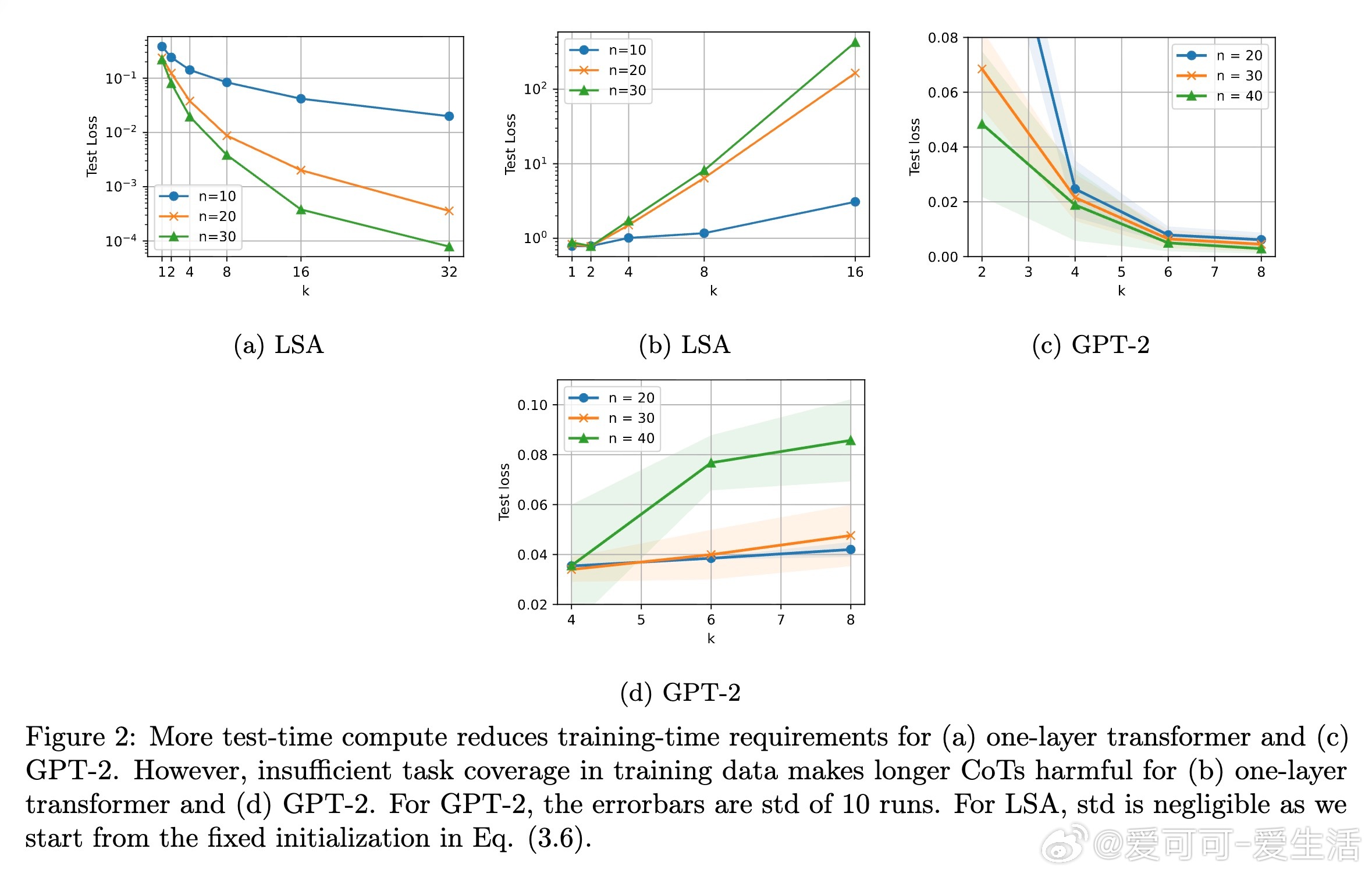 2️⃣ 若训练数据中缺乏解决下游任务所需的技能(对应数据协方差矩阵的方向),增加测试时计算量反而可能降低性能,导致“过度思考”现象。