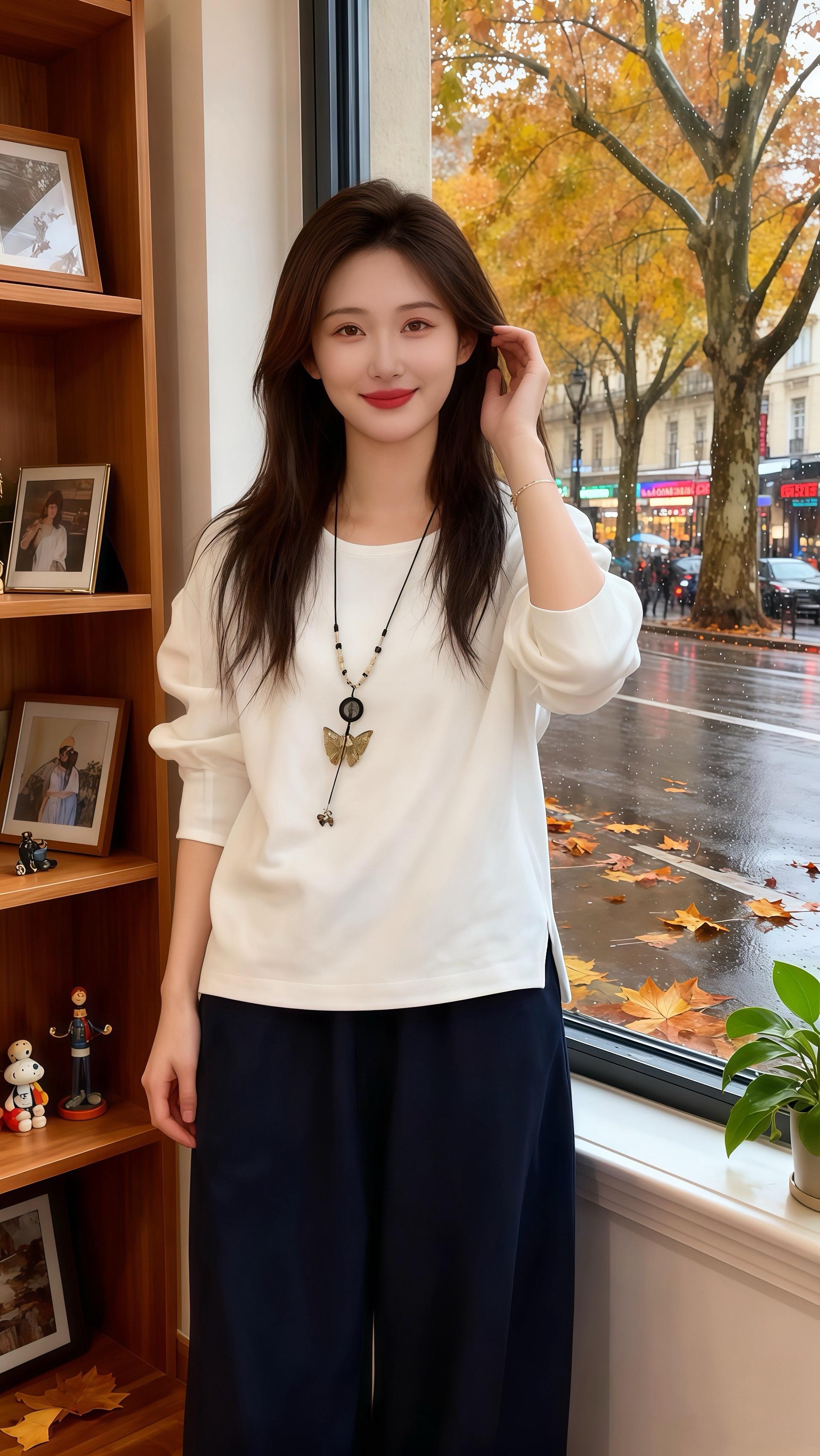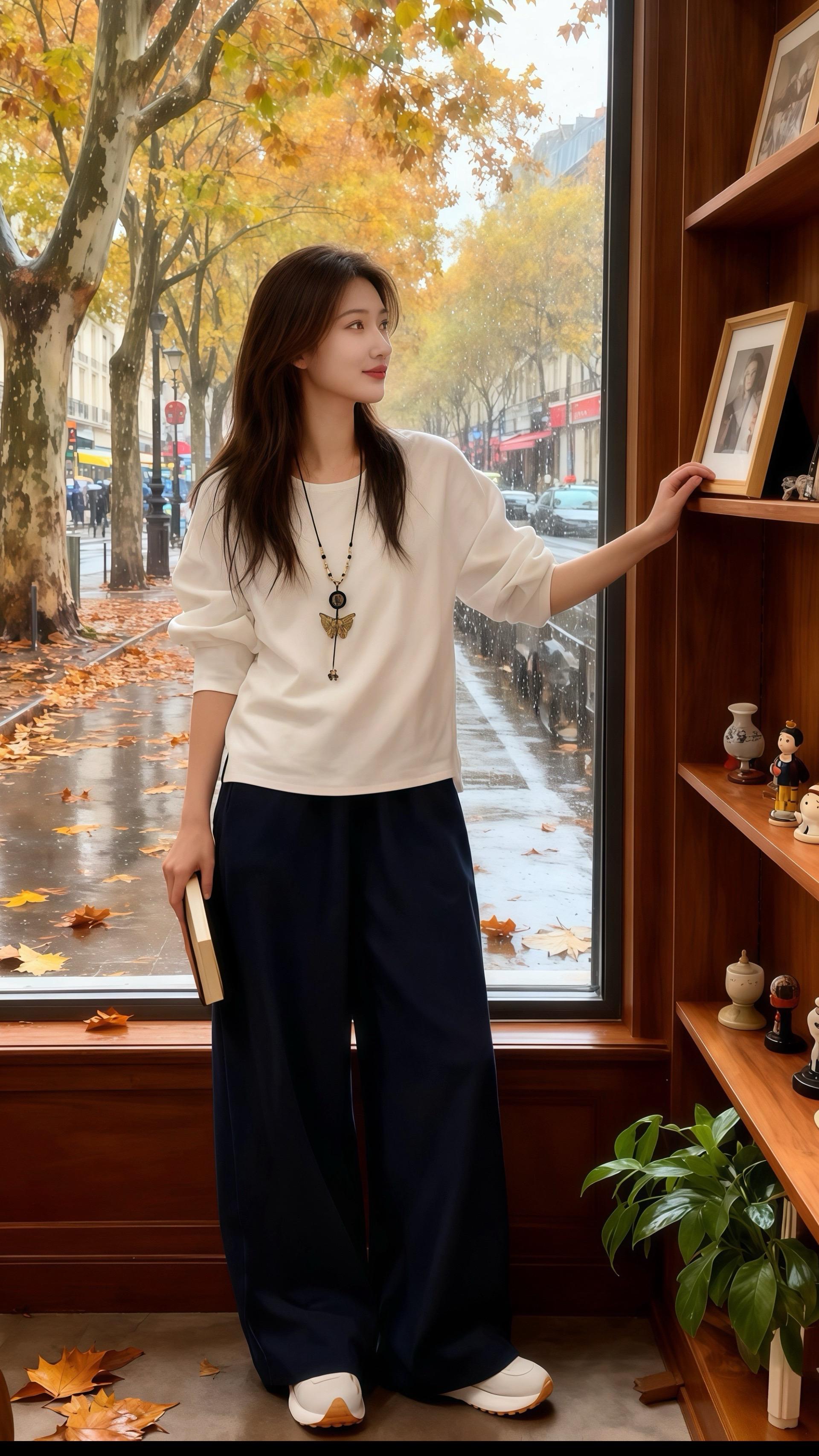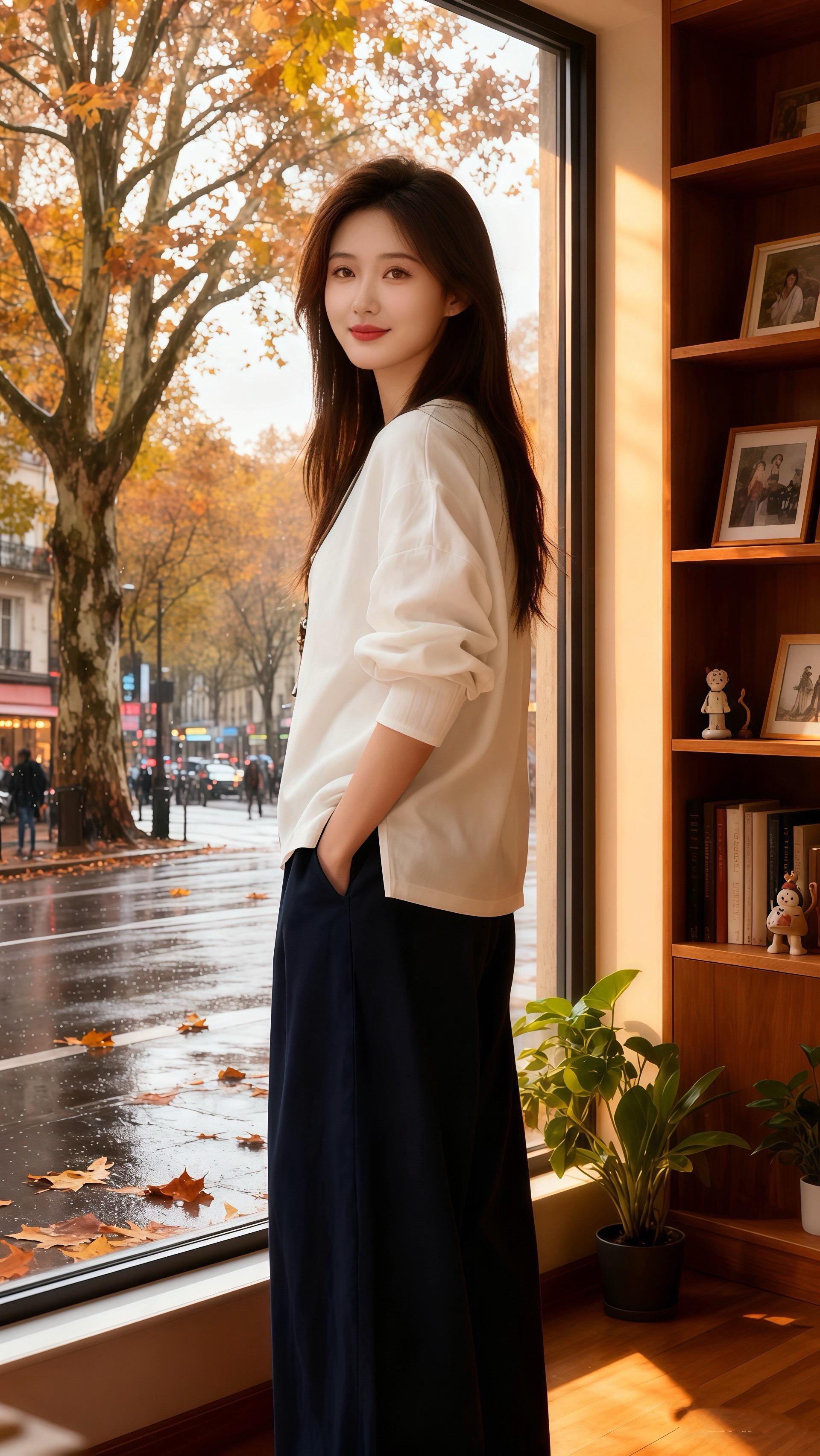 秋日的巴黎,雨丝缠绵。她站在咖啡馆落地窗前,指尖划过湿漉漉的玻璃,凝结的水珠顺着梧桐叶的脉络缓缓坠落。木质书架上,绿萝的藤蔓垂落在泛黄的书页间,相框里的老照片在水光中泛起涟漪。