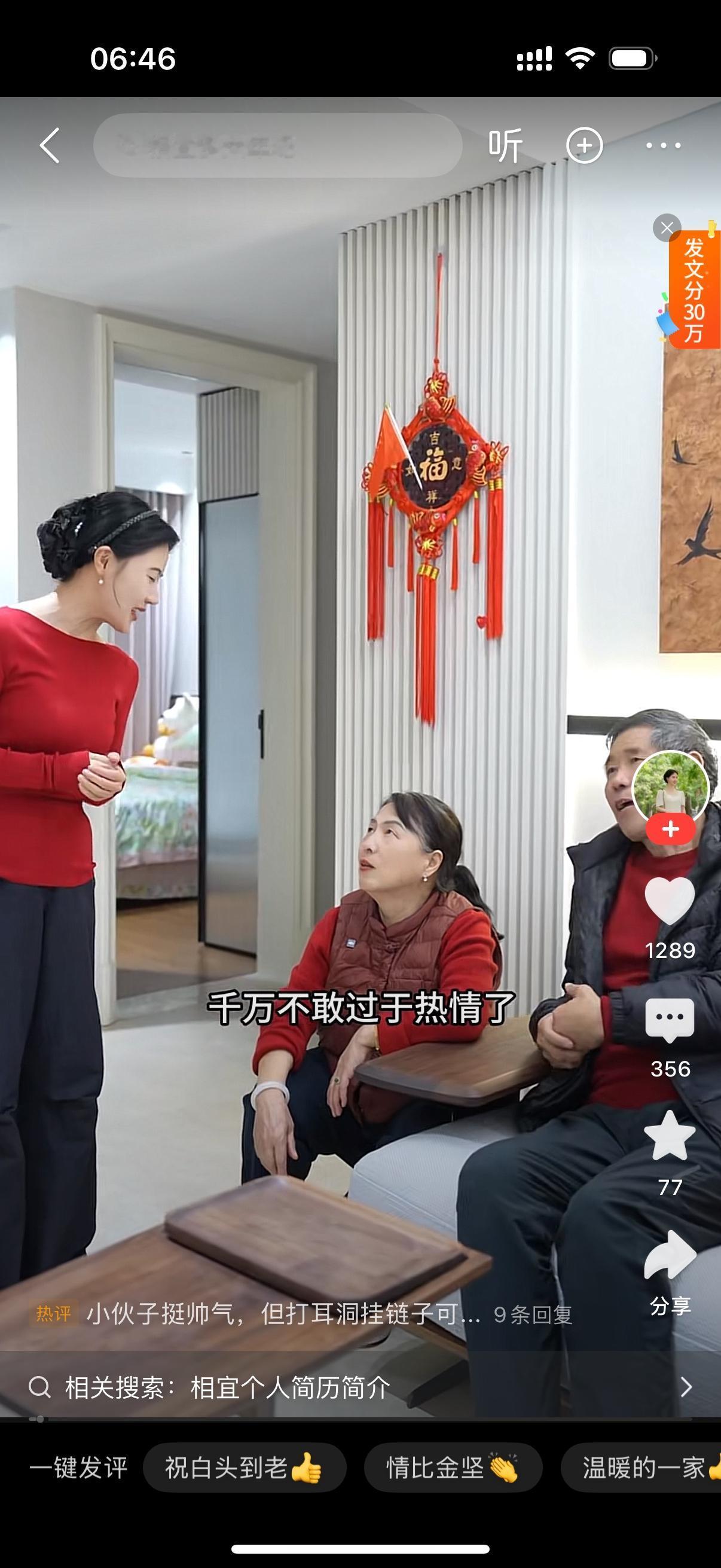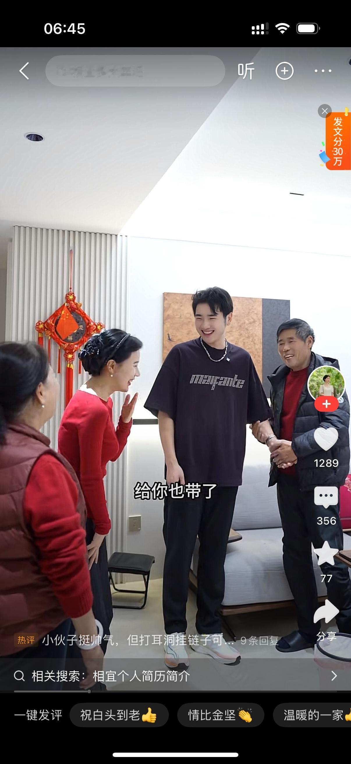 相宜的相亲对象带着一大堆礼物上门来了。相宜面带桃花,乐开了花。很多网友却不看好这个男子,认为他配不上相宜。18岁入社会,不是初中,就是高中,和博士学历的相宜相差太大。打耳洞挂项链,太俗气,和书香门第的相宜太不搭。所以众网友认为这只是一场戏,为了带货精心策划的一场戏。