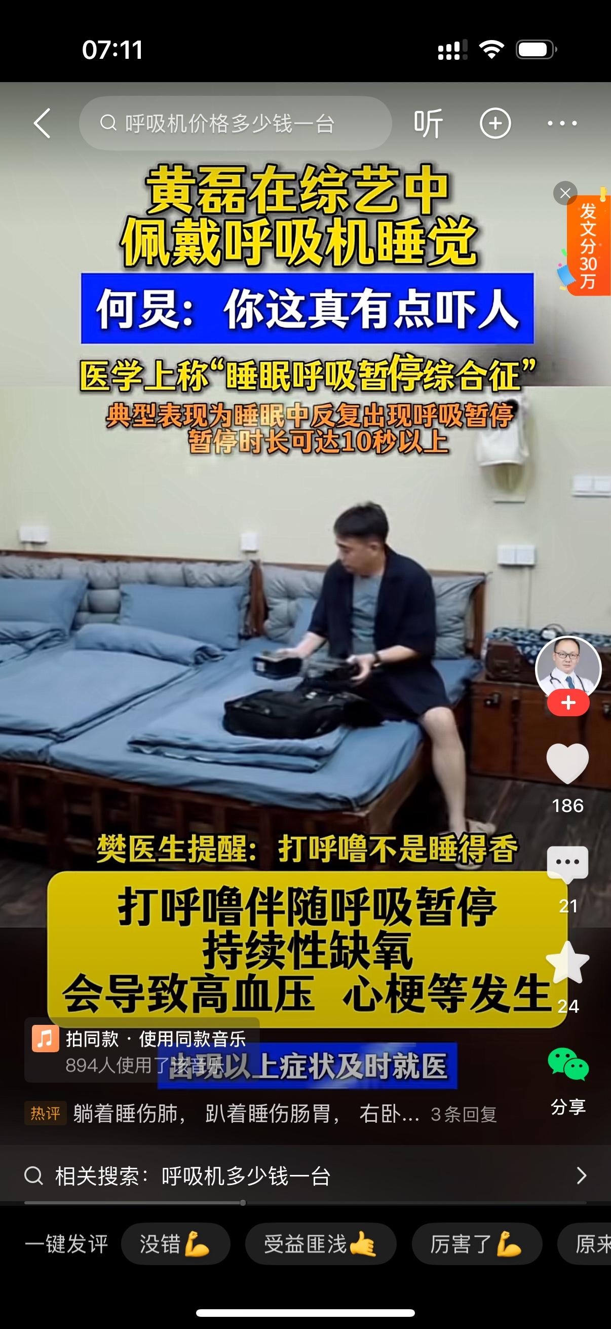 黄磊在综艺节目向往的生活中佩戴呼吸机睡觉,让网友们对黄磊的身体状况表示非常大的担忧。黄磊还不到50岁就出现呼吸暂停症,这是非常危险的。好友何炅就表示他这太吓人了。有钱人如果没了好身体,一切也是白搭。健康永远是最重要的,希望黄磊早日脱离呼吸机,正常的睡一个好觉。