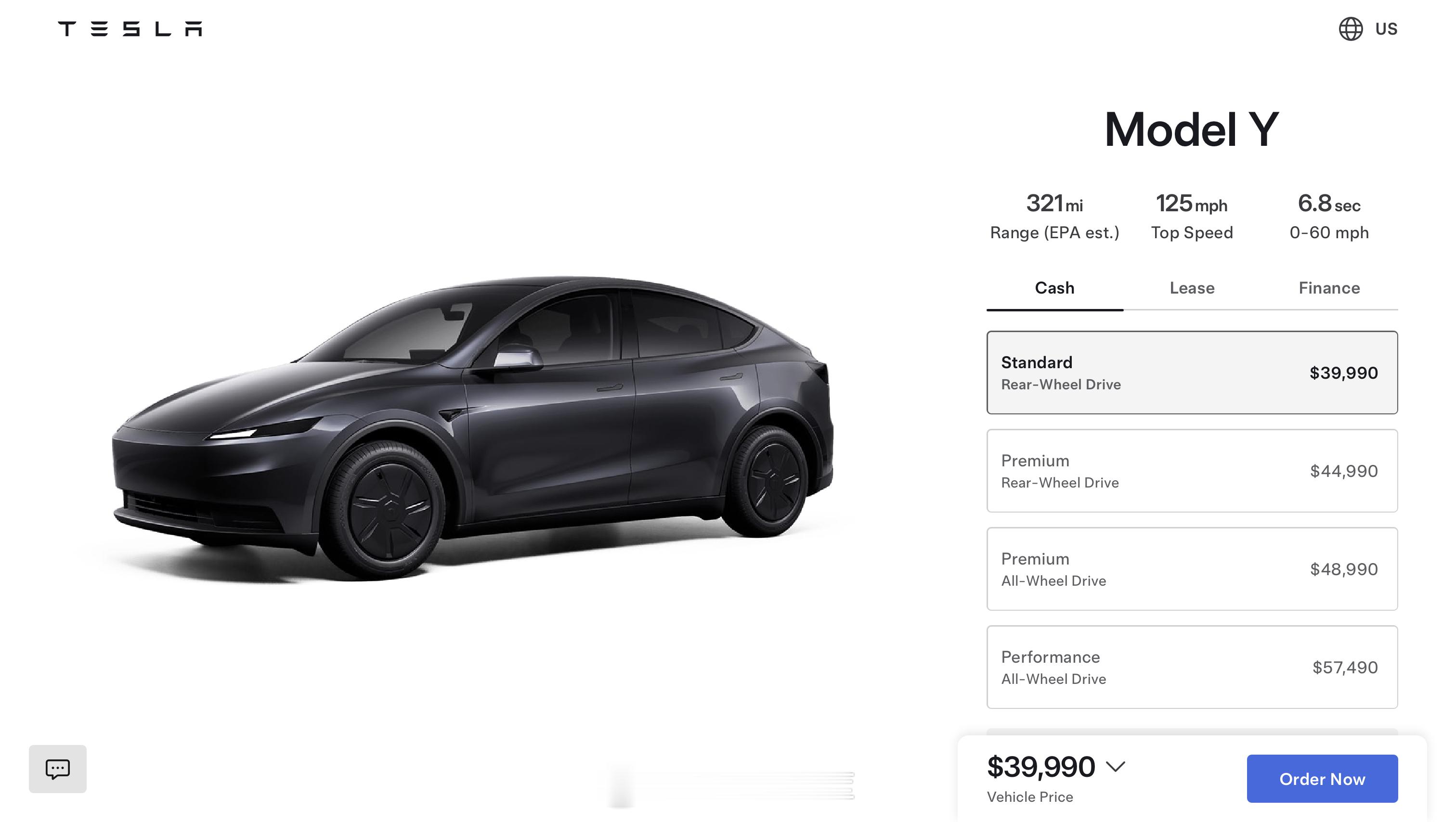 特斯拉ModelY标准版正式发布,目前美国官网已经上线,售价39990