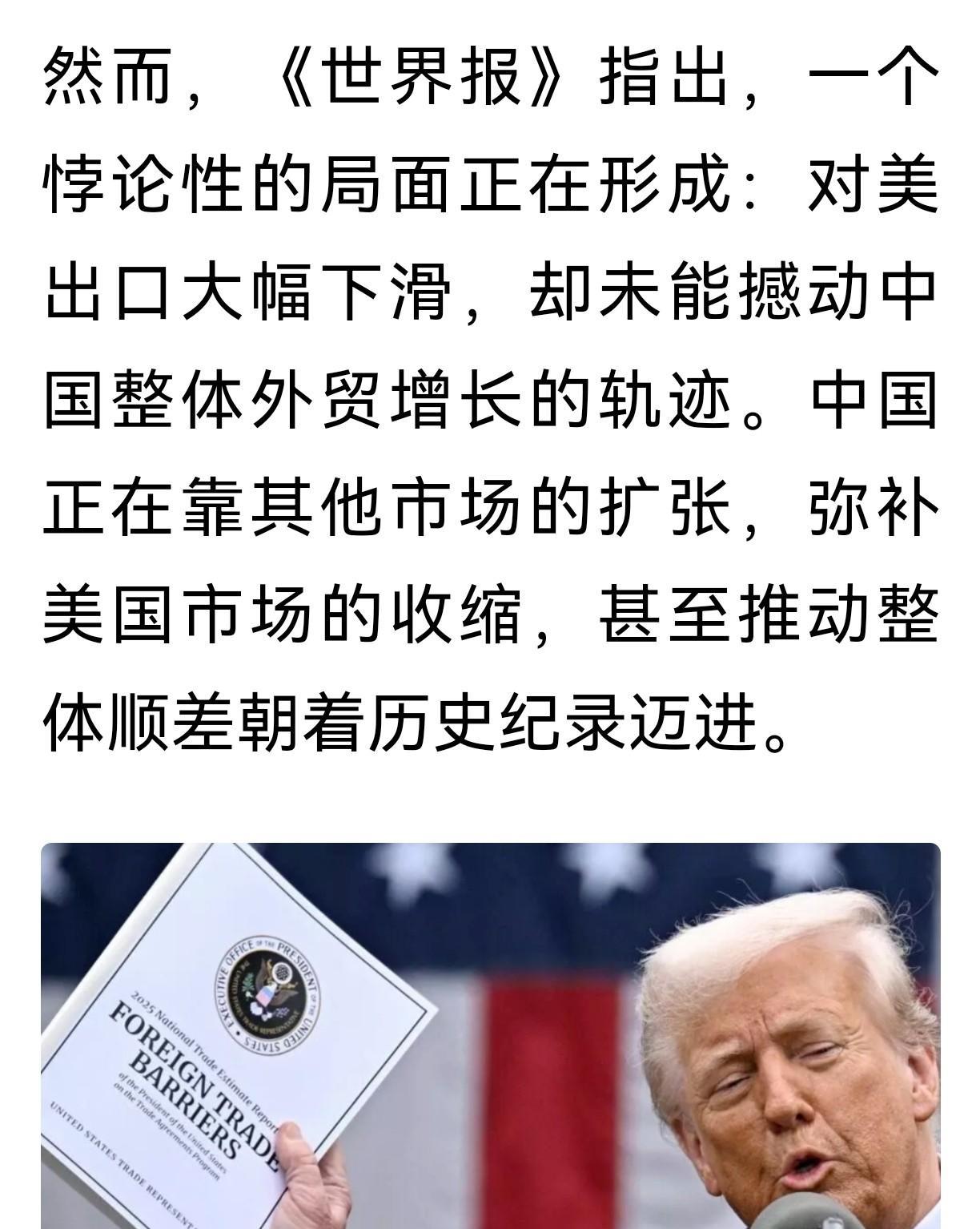 美国手里的牌越来越少 法国《世界报》用大量篇幅分析美国关税政策,数据翔实。最后得出结论:这些原本打击中国的关税措施,不仅没有达到目的,反而推动中国外贸顺差走向新的高点,2025年中国可能实现1.2万亿美元的顺差纪录。 与此同时,中国与美国的双边贸易额大幅下降,前8个月中美贸易额已经降到中国外贸额不足10%,这意味着,美国手里的牌越来越少,能打的更少。 其实这种苗头在中国说对美国加税不予理睬之后就开始了,美国一直以为中国经济离不开他,好吧那就试试。