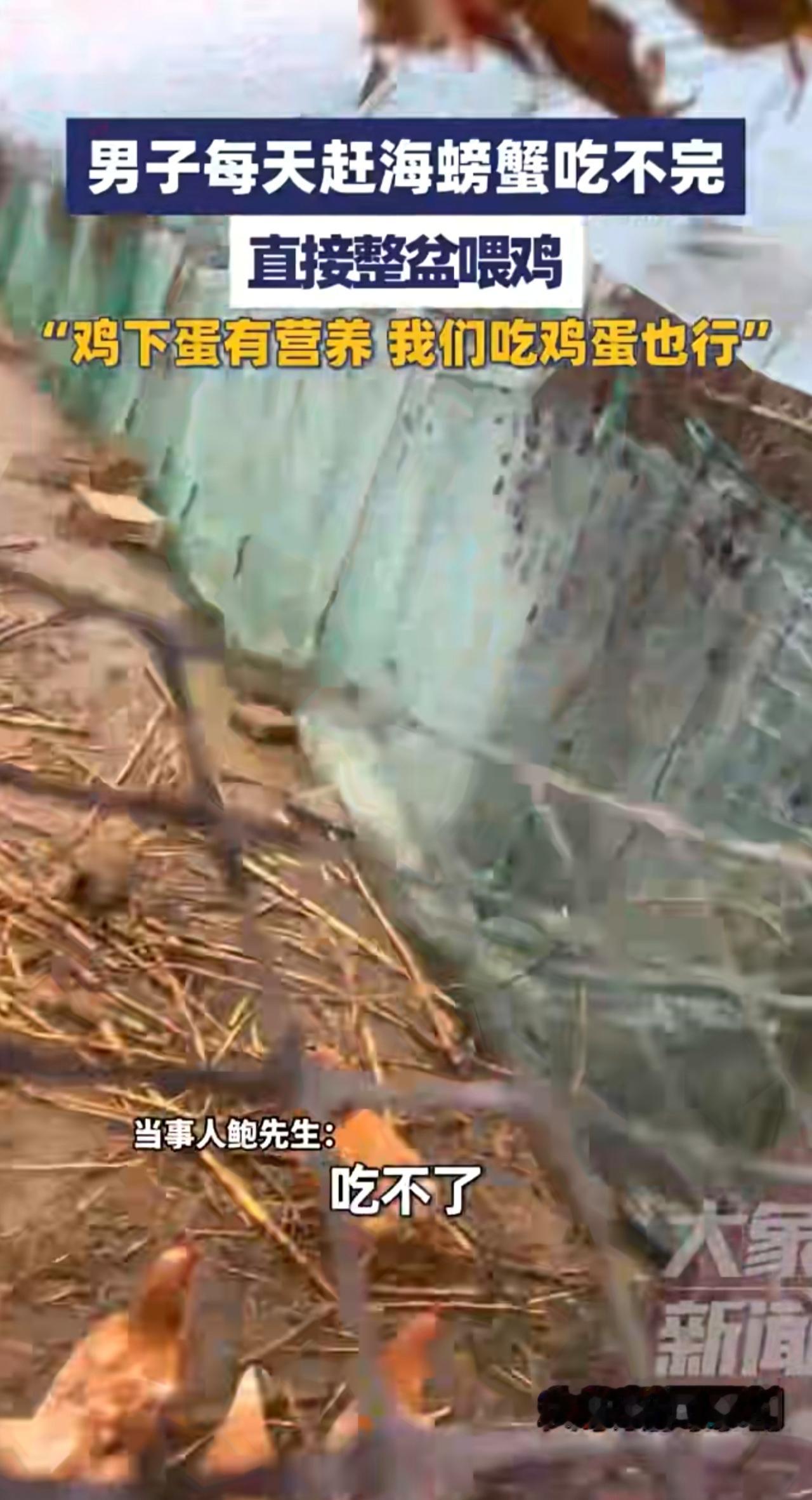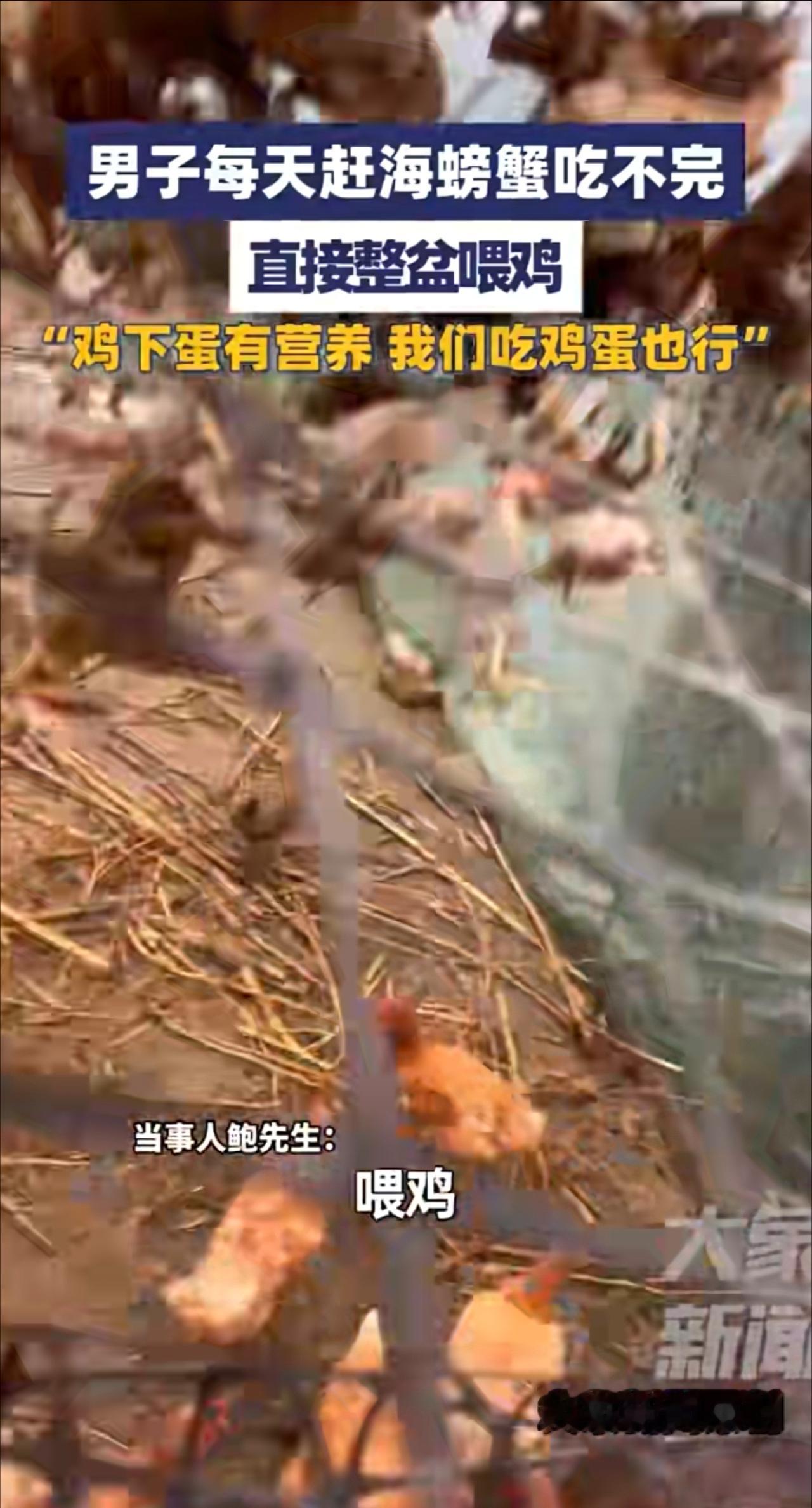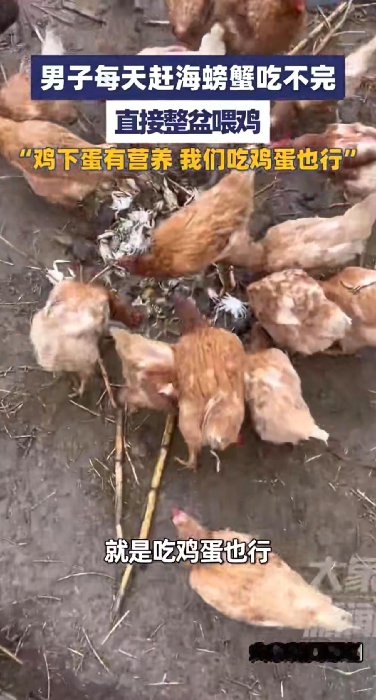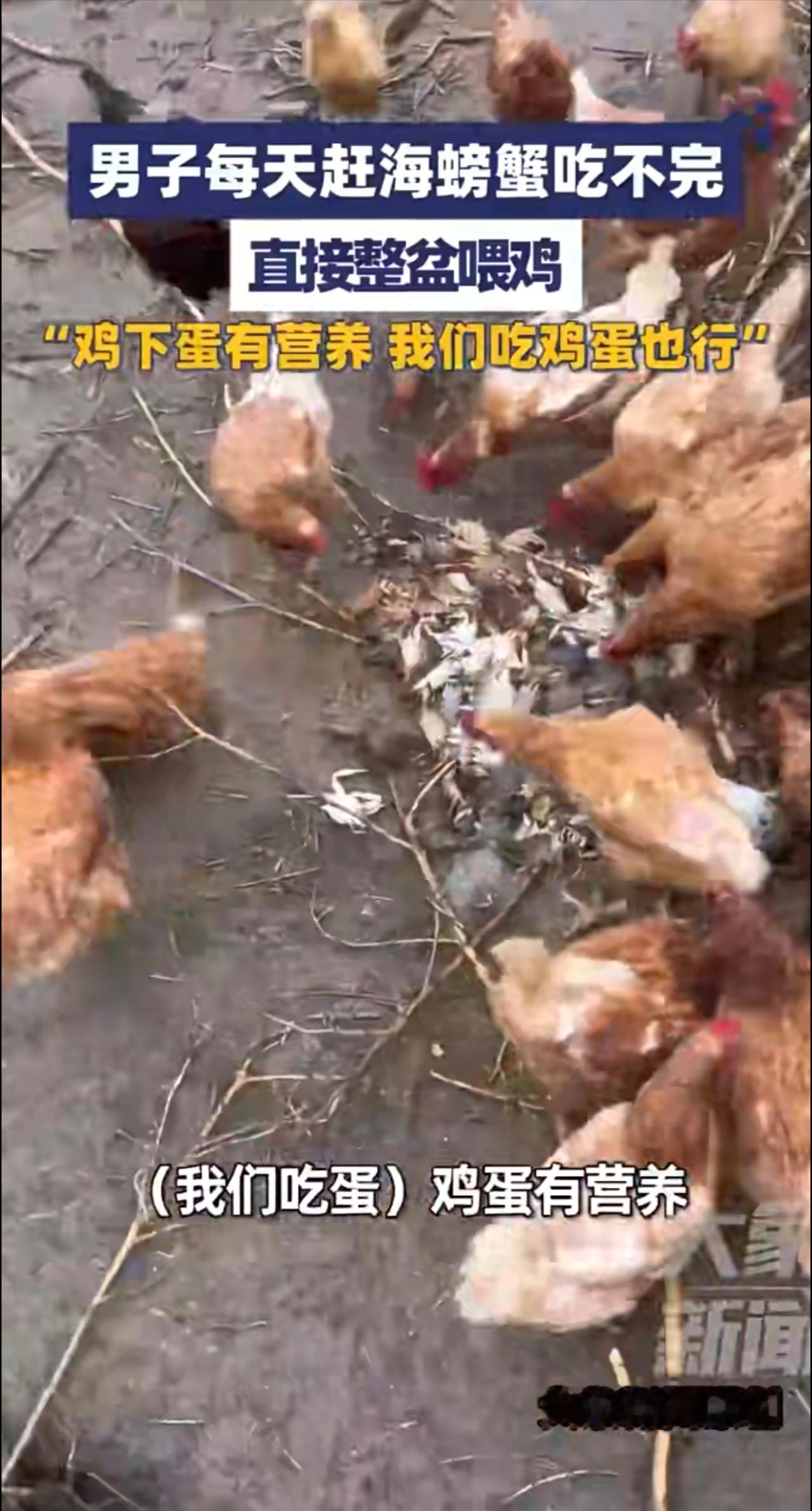 男子每天赶海螃蟹吃不完,直接整盆喂鸡:鸡下蛋有营养,我们吃鸡蛋也行(来源:大象新闻)