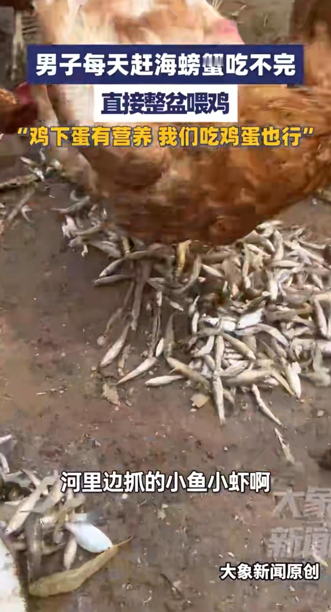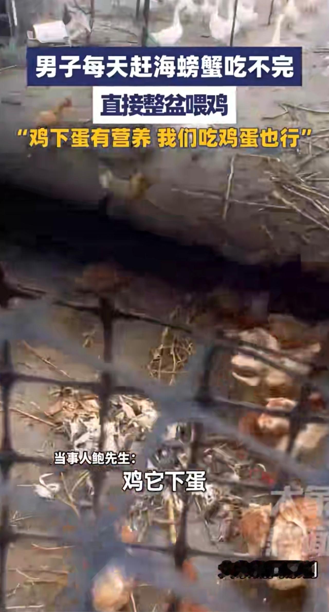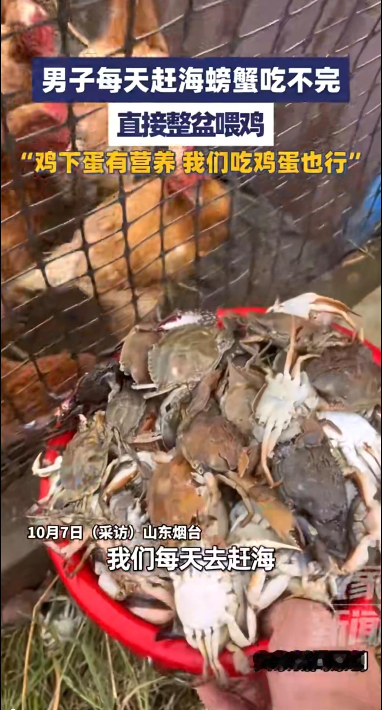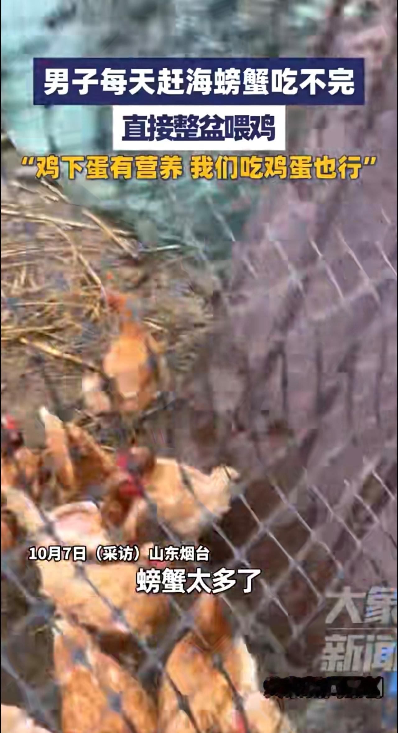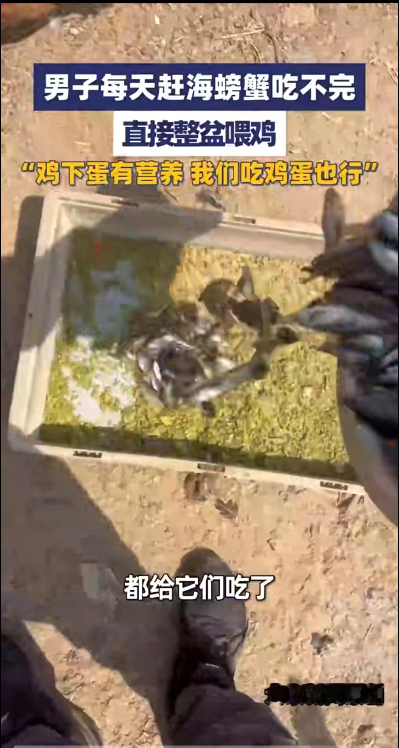 男子每天赶海螃蟹吃不完,直接整盆喂鸡:鸡下蛋有营养,我们吃鸡蛋也行(来源:大象新闻)