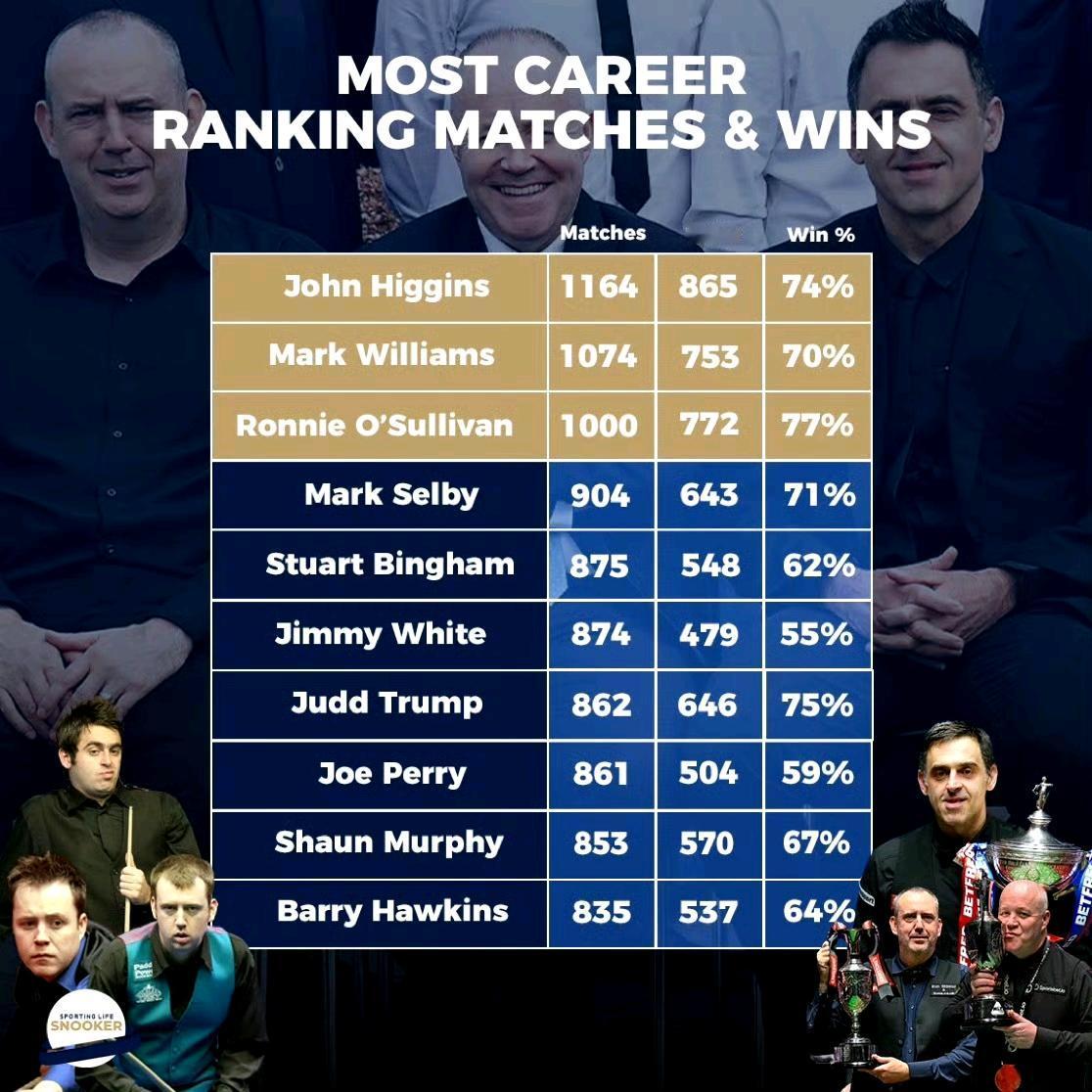 奥沙利文成为75三杰中最后一位达成千场排名赛的球员,但他胜率最高。 希金斯:11
