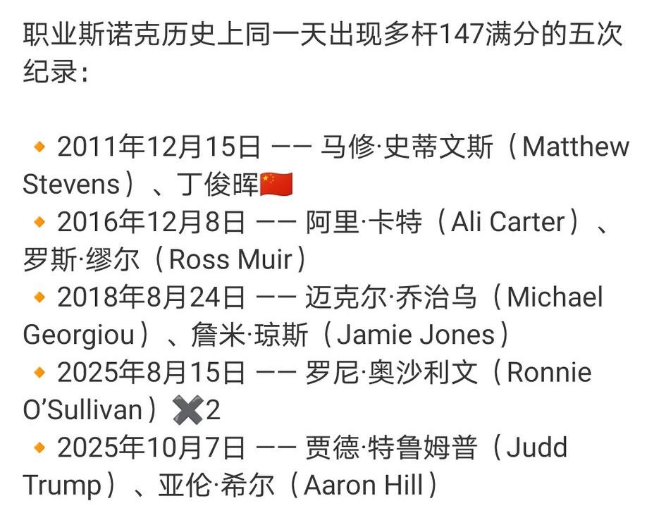 单赛季最多147的纪录为15杆,2024/25赛季创下,本赛季仅仅进行了7站,已打出13杆147,看来要破纪录了。 职业斯诺克历史上同一天出现多杆147满分的情况有5次,见图二。