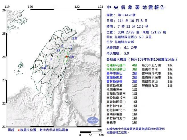 今天上午7點52分花蓮發生規模5地震,地震深度僅6.1公里,屬於極淺層地震,最大震度在花蓮4級,台湾16縣市有感。