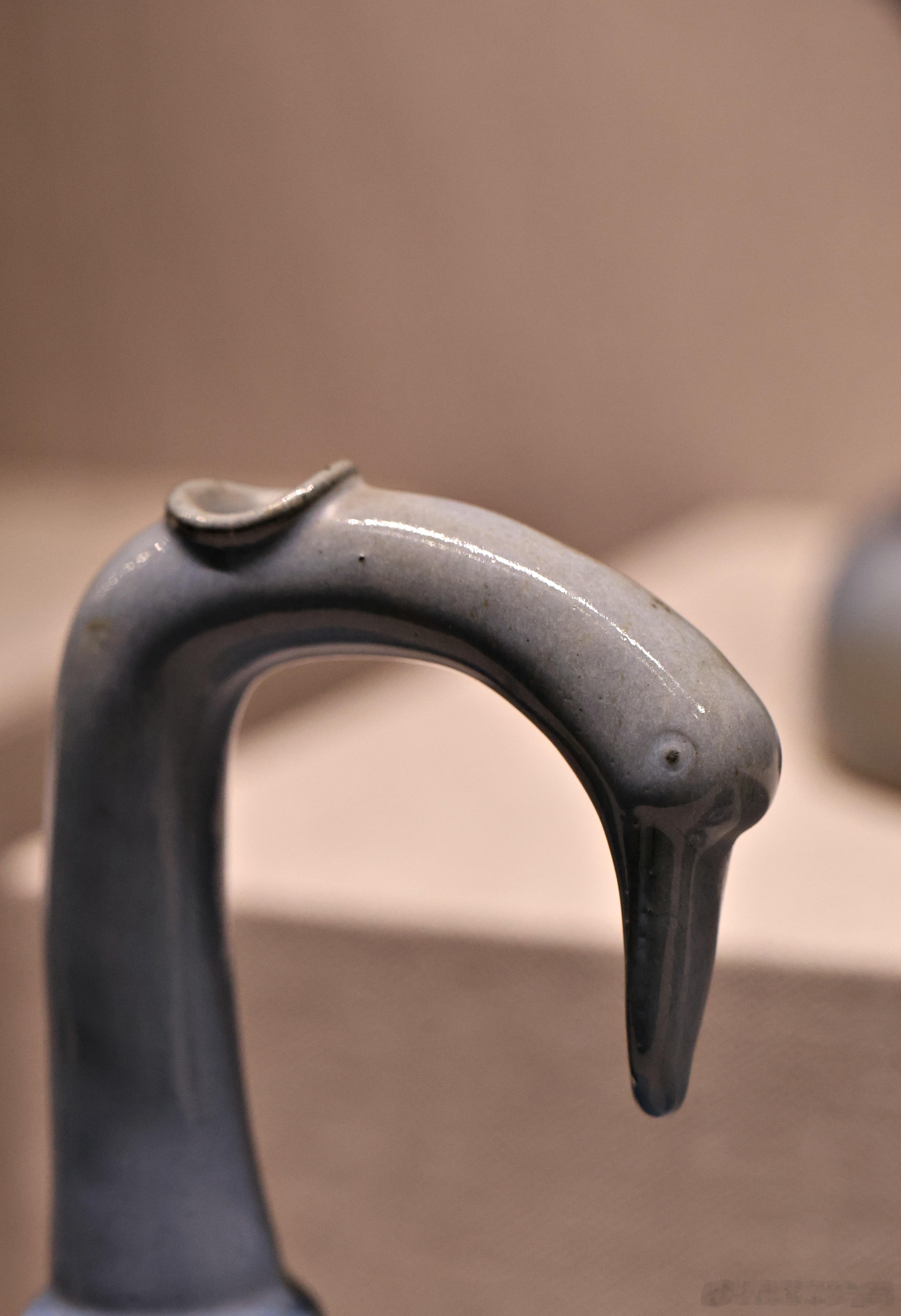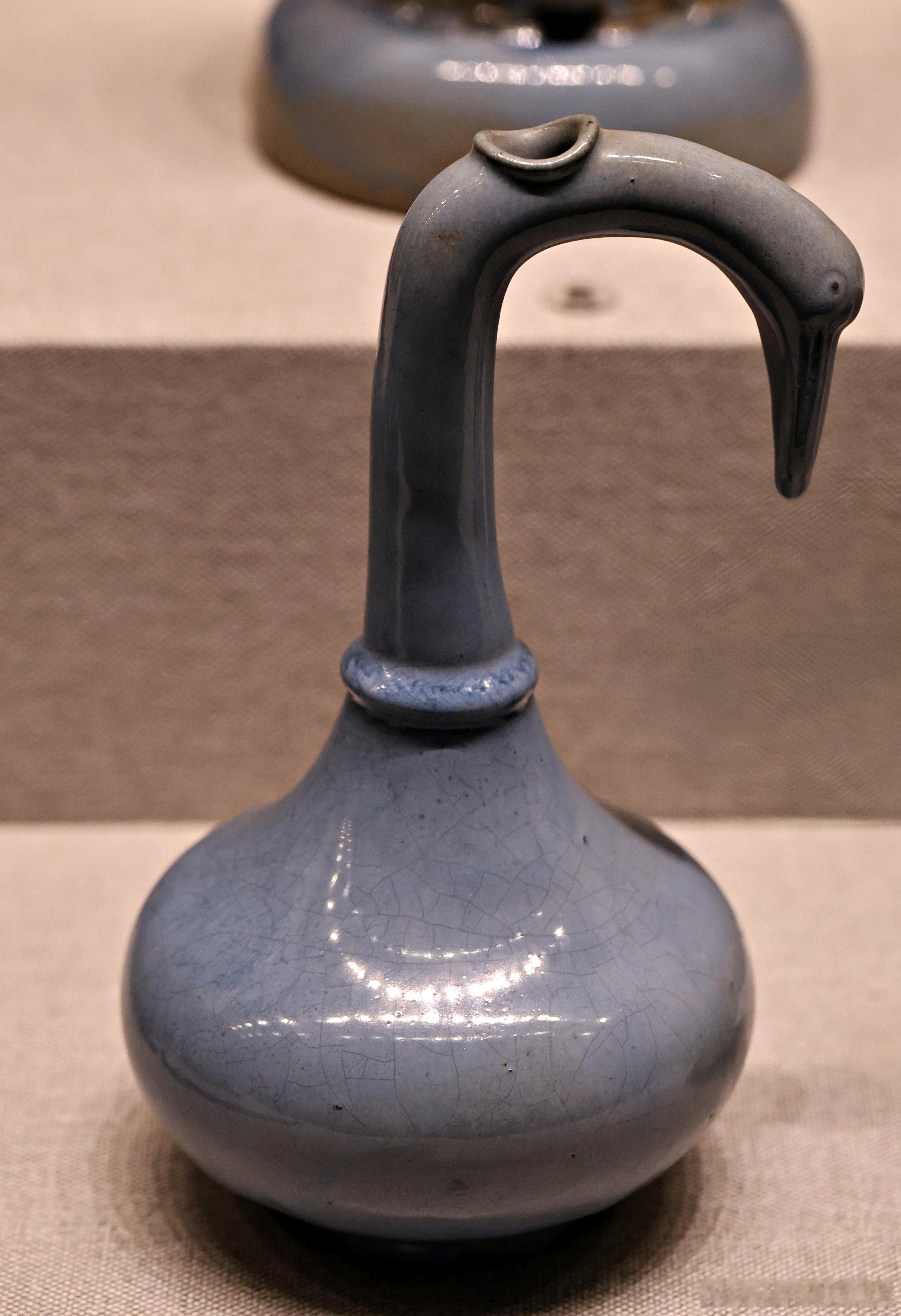 凫是一种野鸭,颈部细长,此壶上部颇似凫低头状,故名凫式壶。壶口在颈部,扁圆腹下垂,浅圈足。颈下部凸起一道弦纹。通体施天蓝釉,釉面有开片纹。无款识。此壶造型生动优雅,色调宁静,堪称颇具审美价值的实用器皿。