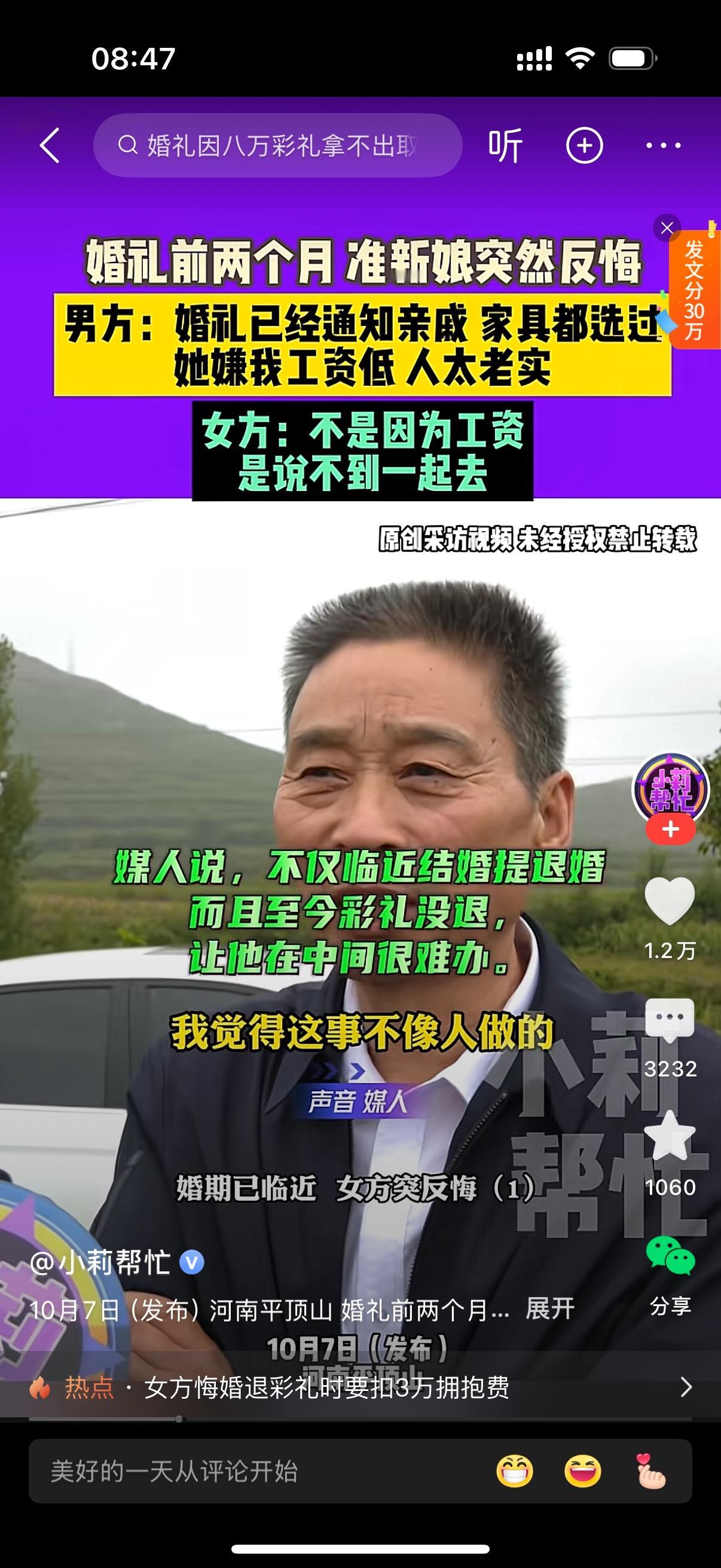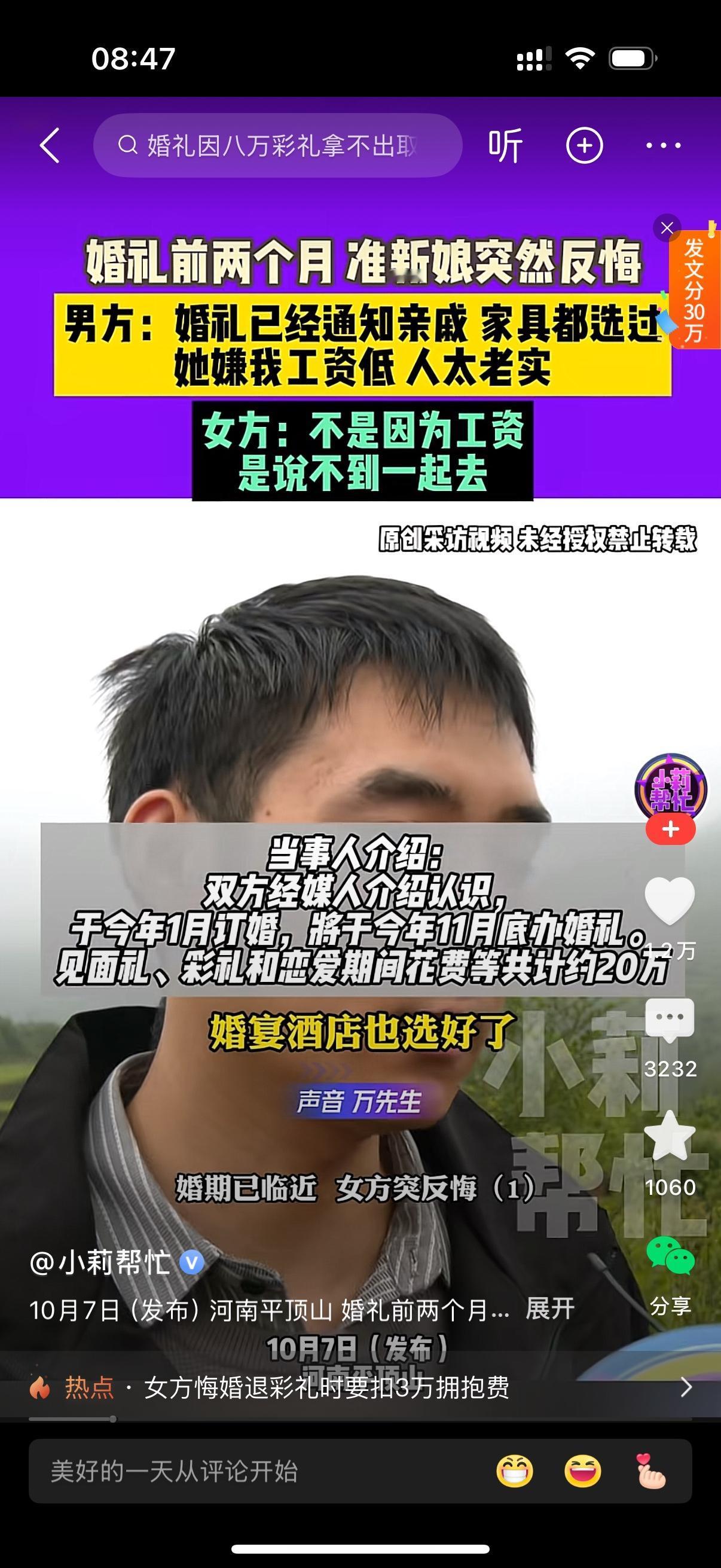 婚礼前2个月,女子突然反悔。男子称婚礼已经通知亲戚,家具也选过了,酒店也选好了。