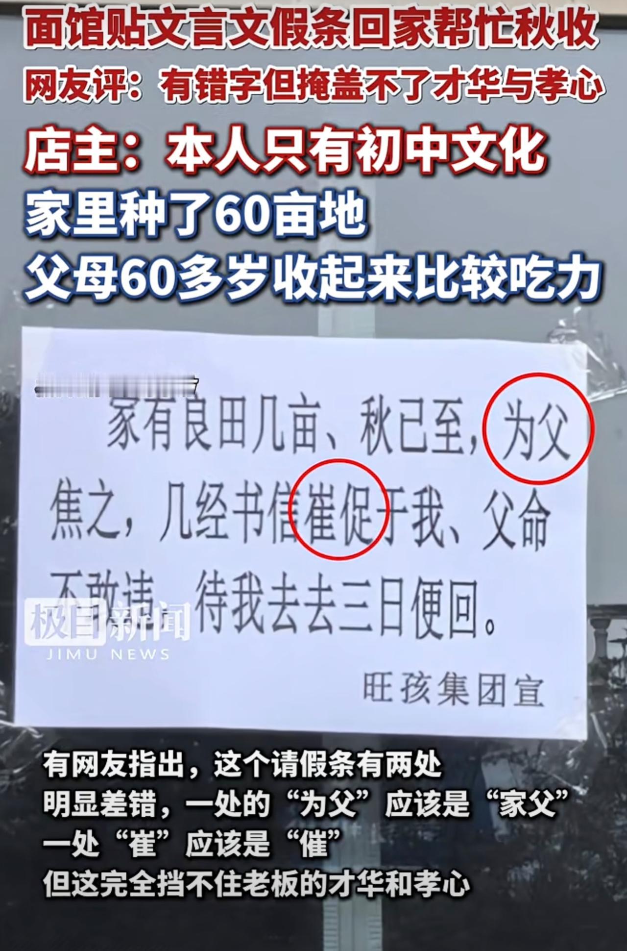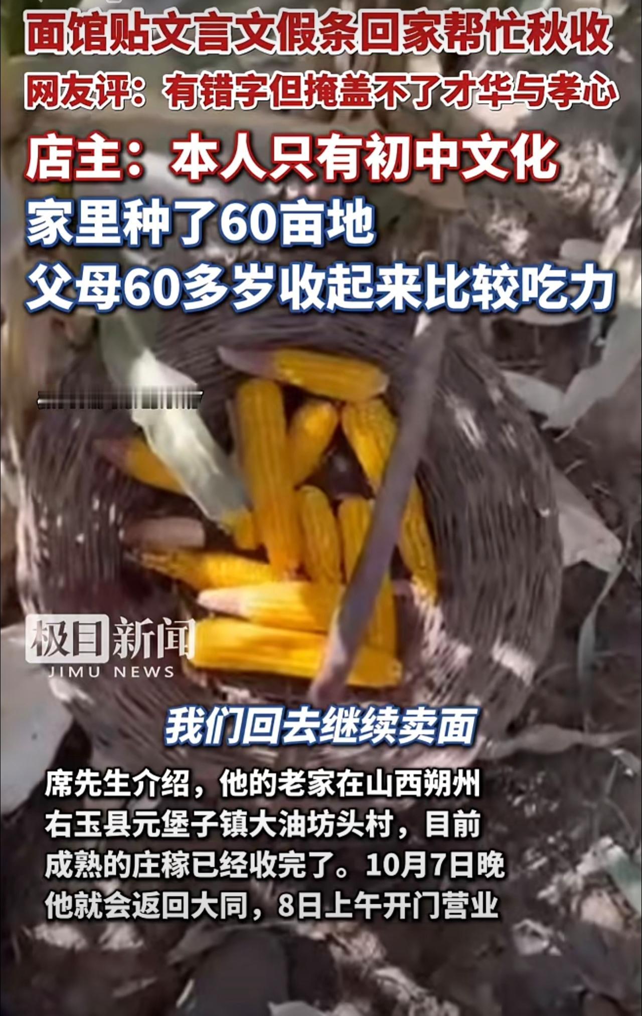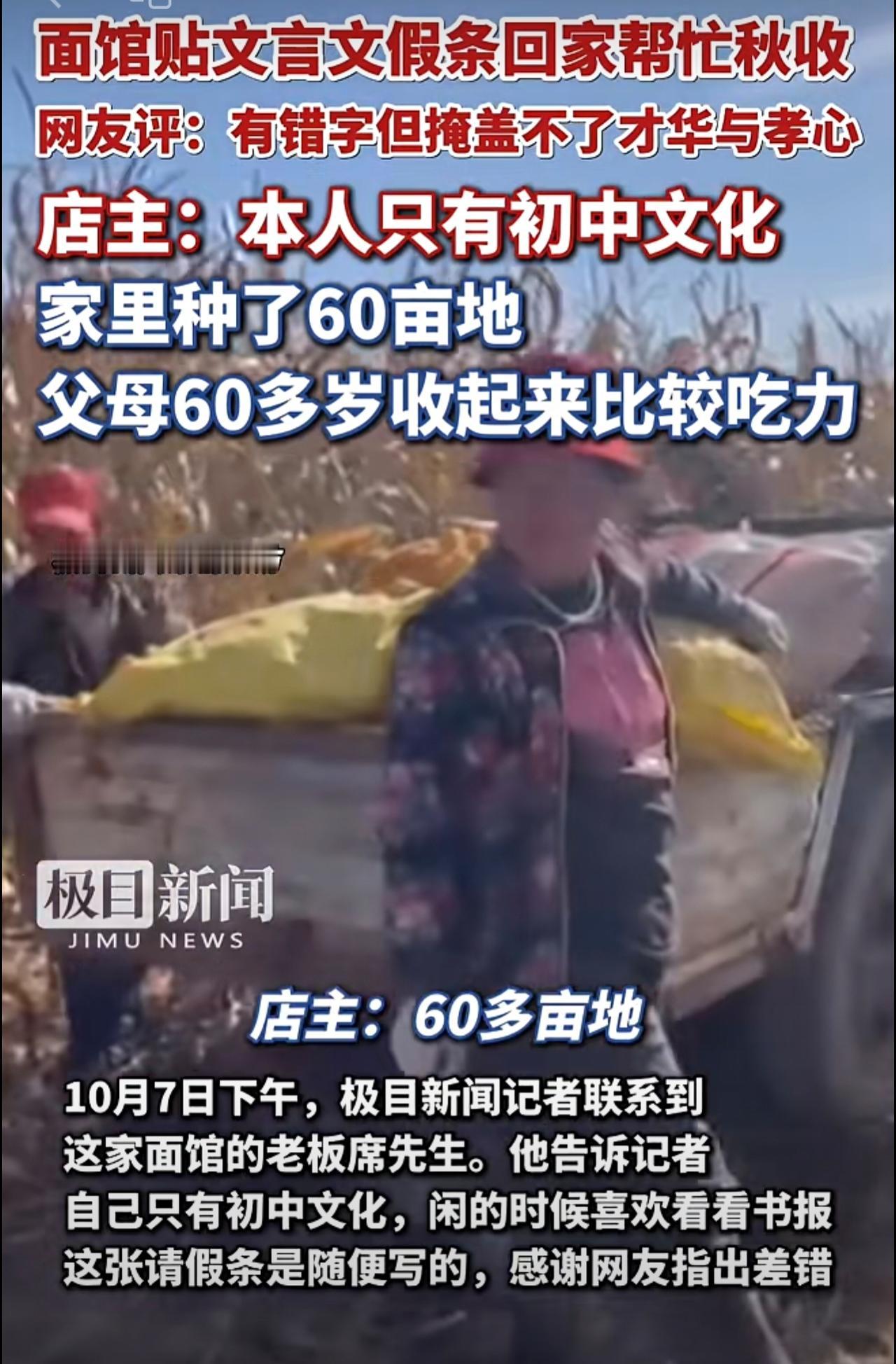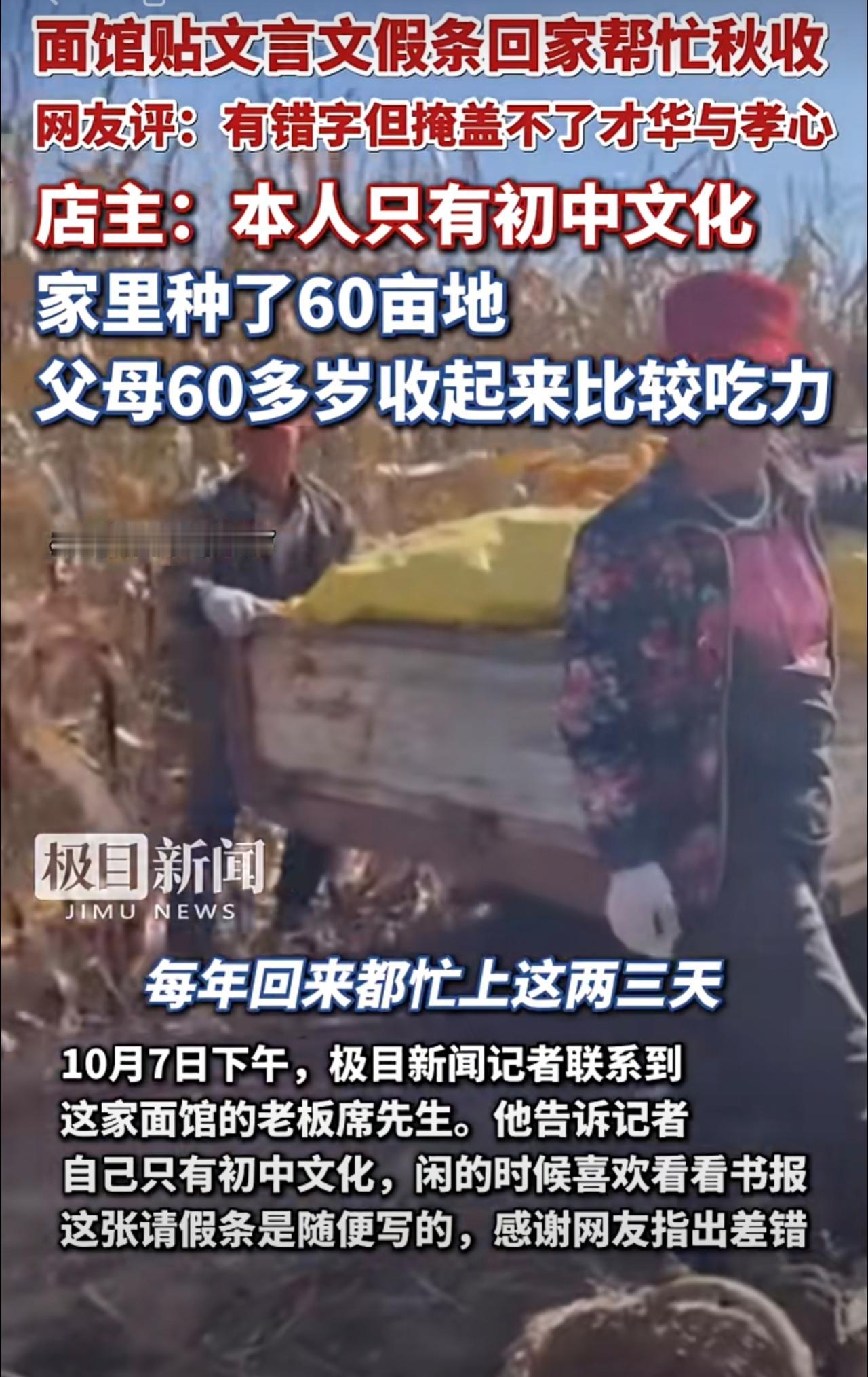 面馆休业几天回家帮父母秋收,文言文请假条引热议。店主:自己只有初中文化,家里种了60亩地,父母60多岁收起来比较吃力。