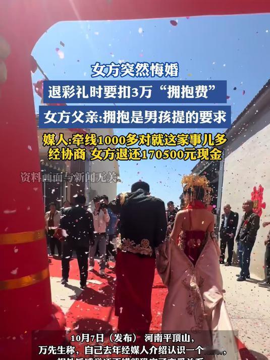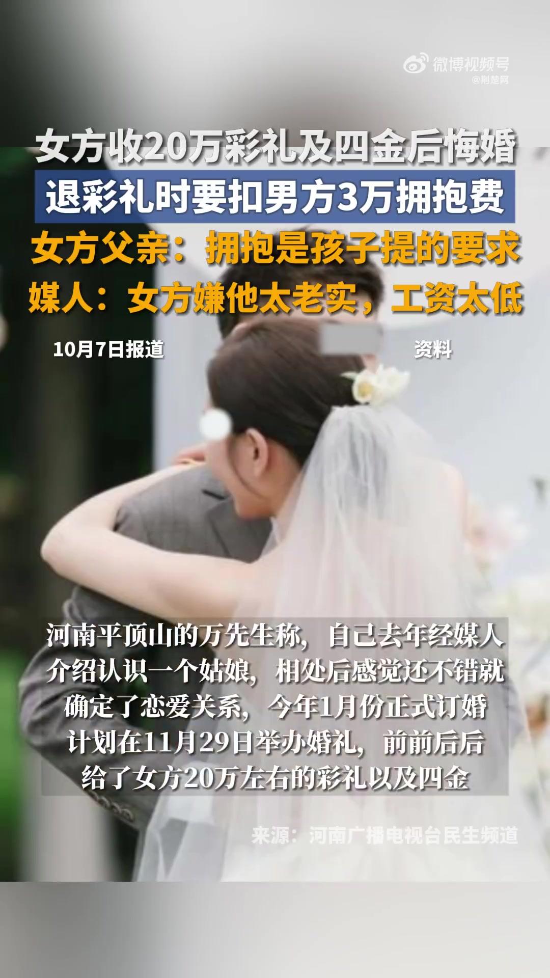 最近河南平顶山发生的这事儿,实在是太奇葩了。万先生经媒人介绍,与一位姑娘恋爱并订婚,前前后后给了20万彩礼和四金。可就在婚期临近时,女方却突然悔婚。此时,男方这边不仅家具、酒店都已订好,连亲戚也都通知到位了。 女方悔婚也就罢了,退还彩礼时竟要扣除3万“拥抱费”!理由是拍婚纱照时有一张拥抱的照片,女方觉得自己吃了亏,女方父亲也承认这是女儿提出来的要求。 这所谓的3万“拥抱费”简直离谱至极。恋爱期间的花销本就是双方共同承担的,拥抱也是你情我愿、相互的行为。好在最后双方协商,女方退还了170500元现金。 这事儿真是让人大开眼界,见识到了什么叫奇葩操作。悔婚还搞出这么一出,实在是令人无语。 河南婚彩礼 河南婚事悲剧 河南信阳彩礼案 订婚悔婚 平顶山婚姻