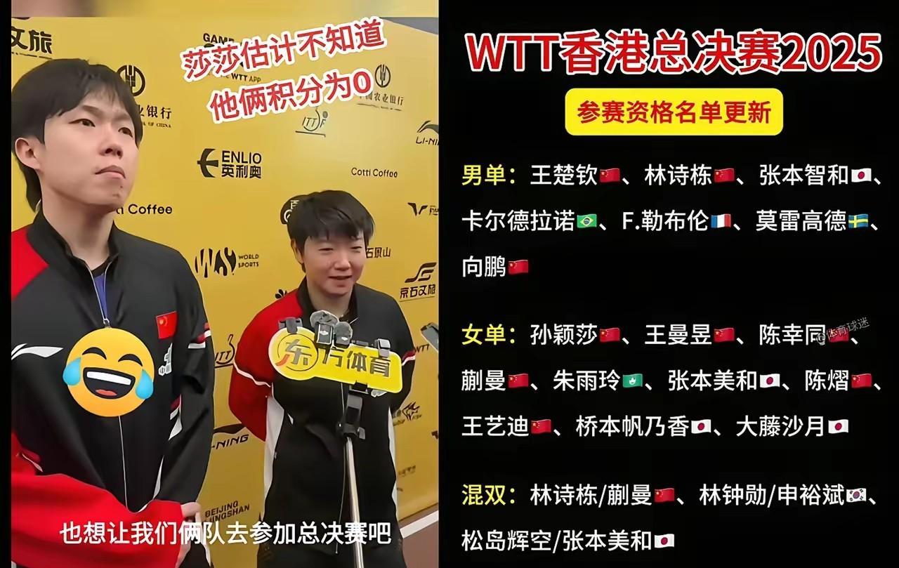 wtt香港总决赛名单发布 意料之外 情理之中 唯一让人不解的是 莎头居然没有入选混双总决赛 那我们小咪乐呵呵地要了三次名额算什么? 连不堪一击的雨果夫妇都进了 莎莎就差瞪着葡萄眼直接要了 港港,我和哥哥想去打总决赛 我们积分不够,回来补上!