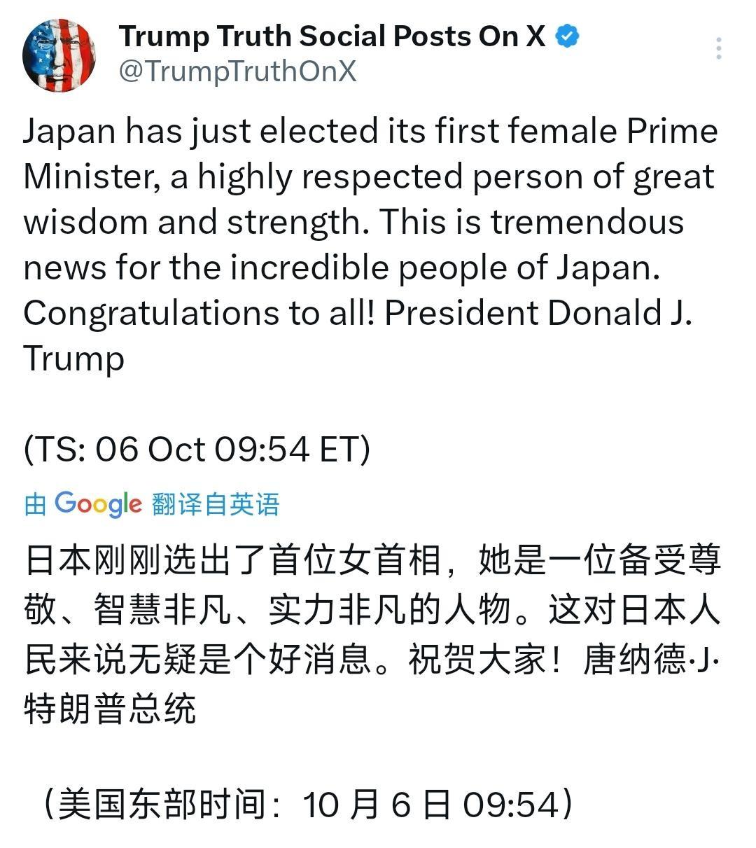 特朗普又闹笑话了!10月6日晚,他在社交平台发文祝贺高市早苗成日本“首位女首相”