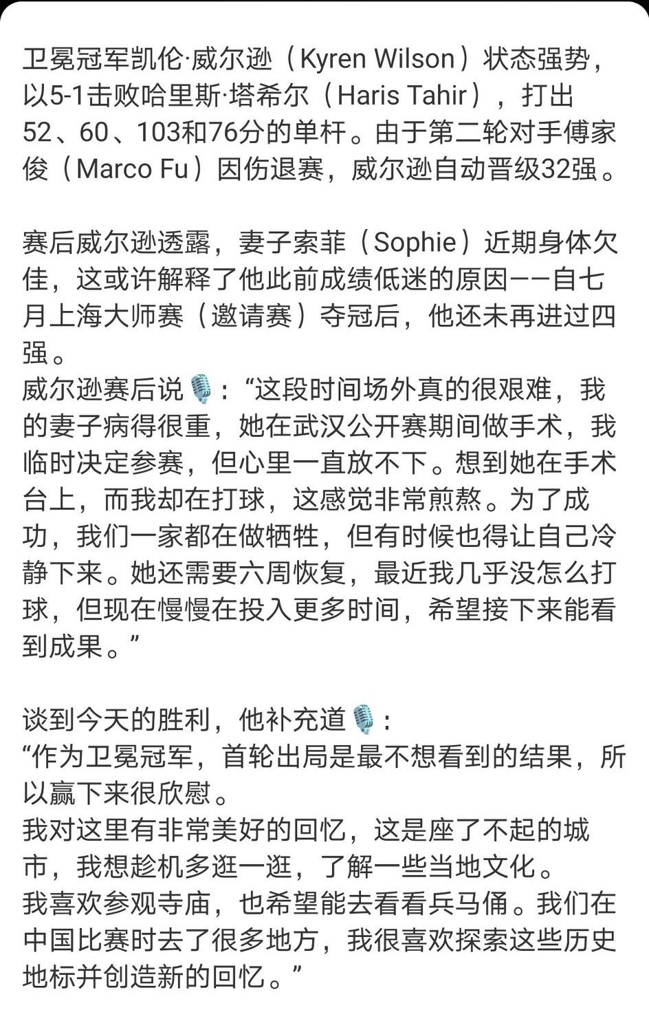 自七月斯诺克上海大师赛夺冠后,囧哥就未进过四强。原因居然是:妻子索菲近期身体欠佳…… 轻松晋级西安大奖赛32强后,威尔逊赛后说:“这段时间场外真的很艰难,我的妻子病得很重,她在武汉公开赛期间做手术,我临时决定参赛,但心里一直放不下……