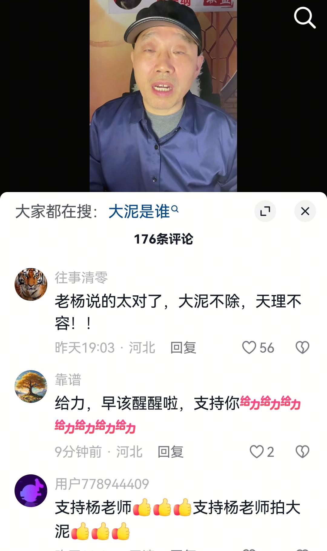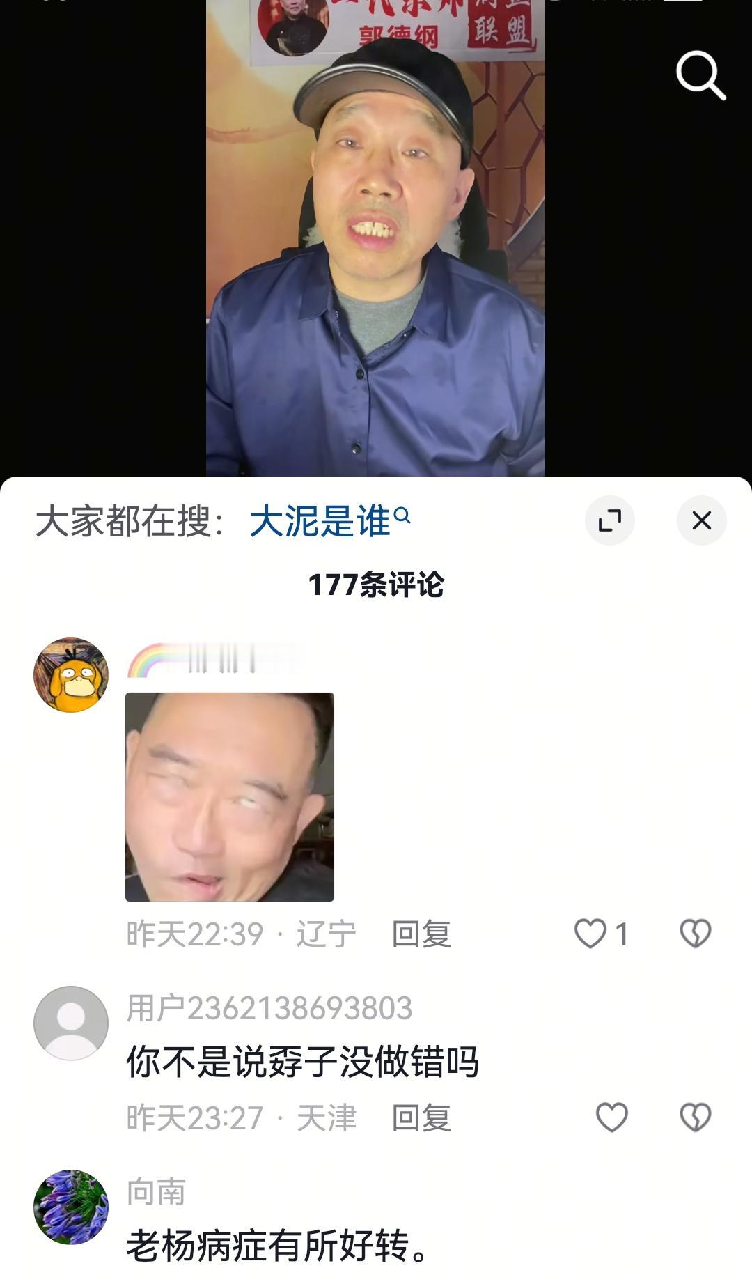 纲丝杨要停播,就因为大泥脏。 刚刷到纲丝杨发的一条视频,纲丝杨表示再也攒不起精神赞扬DYS了,因为他看到了大泥很脏的直播切片。在纲丝杨看来,1、DYS就是山珍海味的大餐,可是有大泥这样的苍蝇在上面飞来飞去;2、大泥人品差,干过好多不入流的事,比如说脏话、直播中为要礼物自扇耳光等;3、老郭应该知道大泥的为人,但却没有拍大泥这只苍蝇,纲丝杨对老郭有意见;4、纲丝杨将暂停一段时间直播,届时看情况是否恢复。 除此之外,纲丝杨还分析了老郭没拍大泥这只苍蝇的原因,并恳切建议老郭拍这只苍蝇。 对于纲丝杨此番表态,网友评论踊跃,有人称赞他说的对,有人揭短他曾对大泥的肯定,还有人发动图予以调侃。 各位网友,您对纲丝杨的表态怎么看?德云社 德云社现状探讨 郭德纲