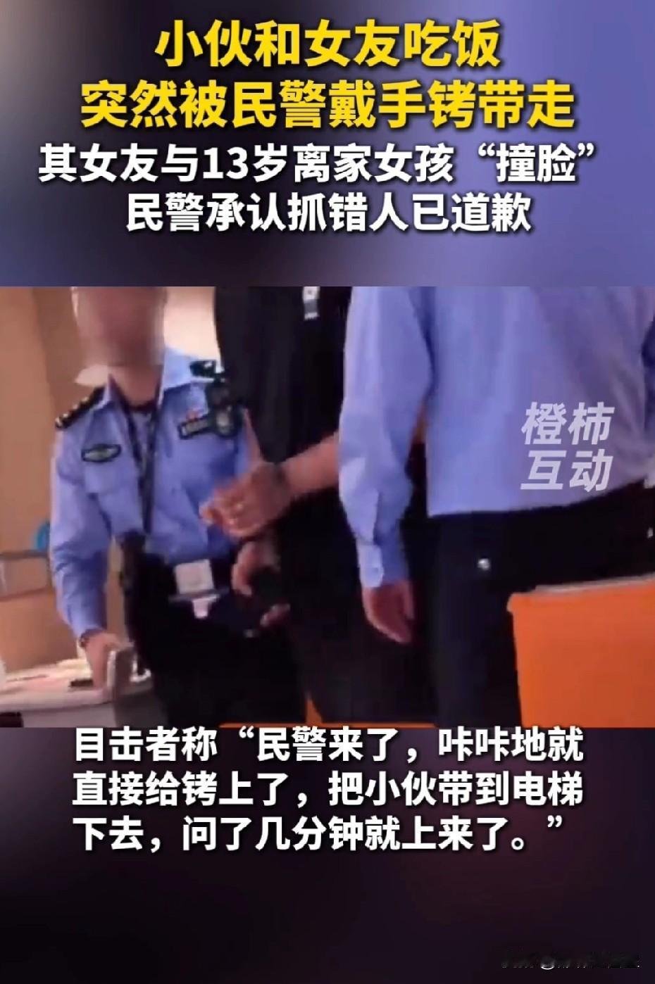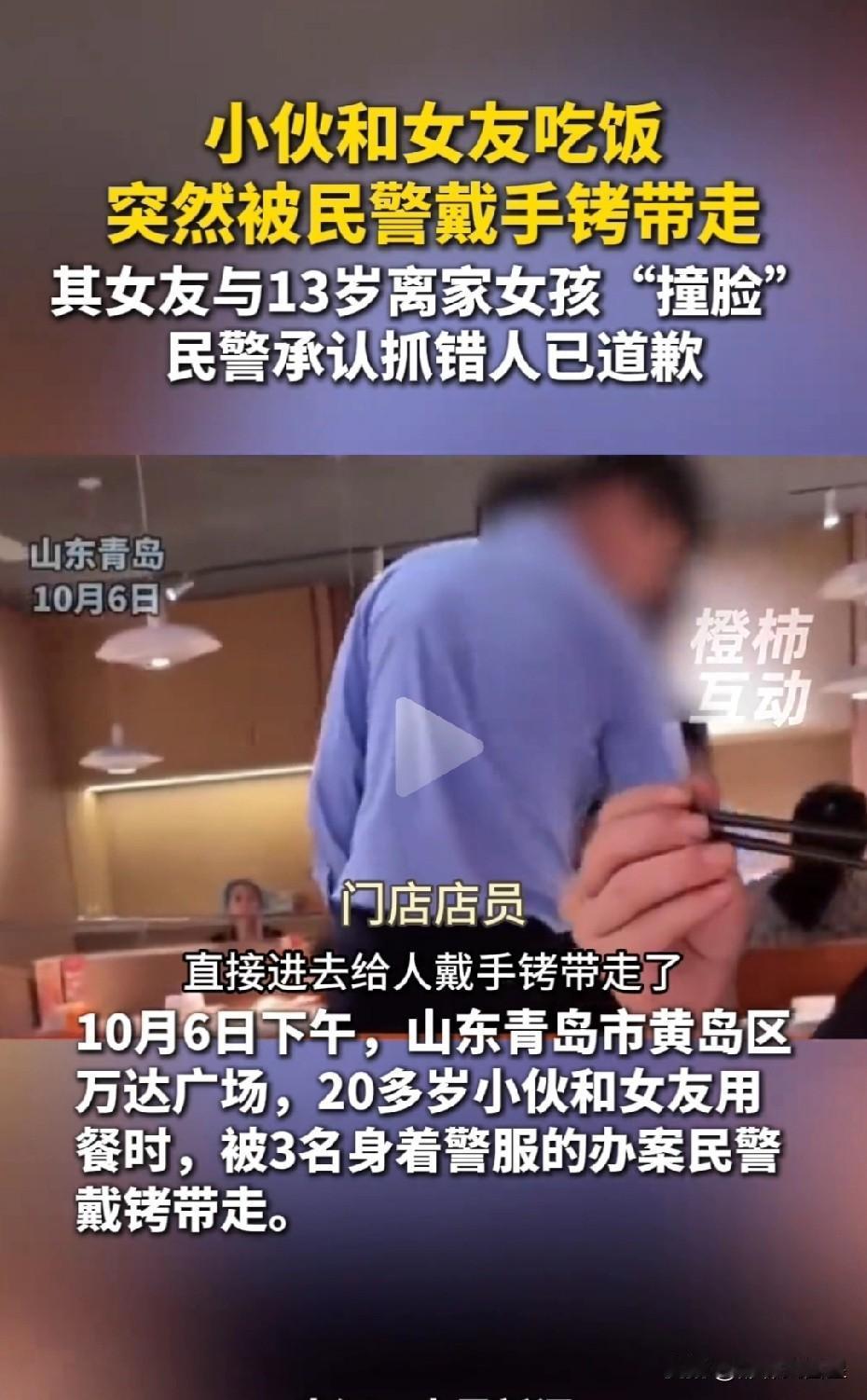 虚惊一场! 10月6日,山东青岛。一名20多岁的小伙和女友正在一家餐馆用餐。突然3名身着警服的办案民警进入餐厅,没等小伙反应过来就给他戴上手铐。小伙询问“你好,怎么了?”,得到的回应是“你不要说怎么了,抓的就是你!” 这一幕让店员和其他食客都十分震惊,门口也围起了看热闹的人群。 原来,这3位民警是在办理一起走失案。他们将小伙女友的长相与家长提供的离家出走13岁女孩的照片进行比对,认为高度吻合,便怀疑发生了拐卖案。民警此前给小伙打电话,小伙以为是骗子,挂了好几次电话还拉黑了,所以民警直接到店里将其带走。 不过,五六分钟后,小伙在民警陪同下回到店内。民警发现抓错人了,是人脸识别出了问题,并向小伙当面道歉。 真是虚惊一场! 但是有网友表示,民警执法时存在两点错误,一是没亮执法证件,二是没有调查清楚就直接上手铐抓人。 对此,大家怎么看?